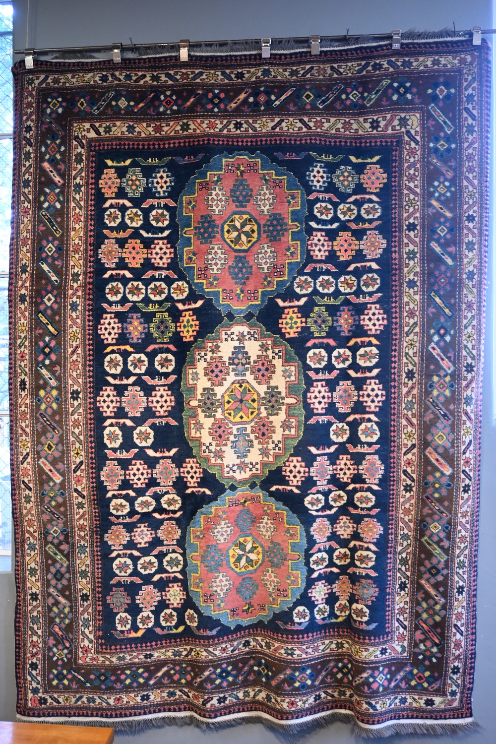 A RARE OFFERING. ANTIQUE RUSSIAN CAUCASIAN RUG CIRCA 1950'S AN ABSOLUTE COLLECTORS RUG AND EXTREMELY HARD TO SOURCE. THIS EXTREMELY COLOURFUL EXAMPLE IS SUPERBLY HAND KNOTTED AND HAS RECEIVED MUCH ATTENTION BY A MASTER RESTORER AND IS PROFESSIONALLY RESTORED TO GALLERY CONDITION. 100% NATURAL DYES AND 100% WOOLLEN PILE AND FOUNDATION WITH SUPERB VIBRANT COLOURS IN THE STAR OF THE EAST MOTIFS. ALL OVER INTONES OF INDIGO BLUE, GOLD, COGNAC AND FRENCH BLUE, SOFT RED AND GOLD TONES. SOME MINOR RESTORATIONS. SIZE: 270 X 204 CM ORIGIN: IRAN - RRP: $9,800 DOCUMENTATION OF AUTHENTICITY INCLUDED