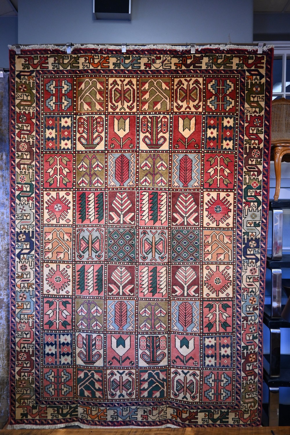 A TRIBAL DESIGN PERSIAN HASHTRUD RUG. 100% WOOL PILE, NATURAL DYES. HAND SPUN TRIBAL WEAVE WITH TRIBAL PANEL GARDEN DESIGN CONTAINING FLORAL AND TREE MOTIFS. ALL OVER SOFT MELLOW TONES. SIZE: 300 X 207 CM ORIGIN: IRAN - RRP: $2,800 DOCUMENTATION OF AUTHENTICITY INCLUDED.