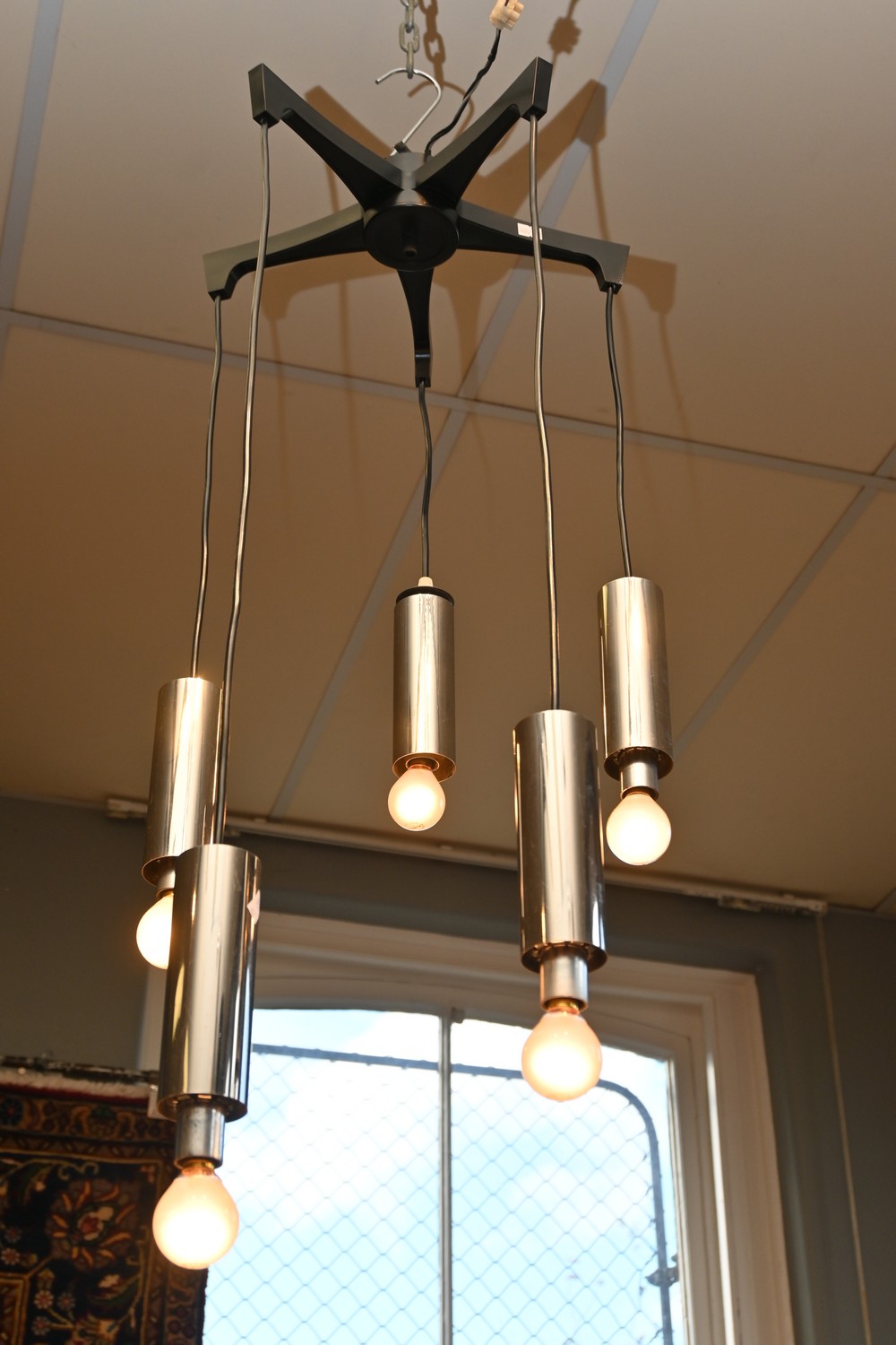A STAINLESS STEEL DANISH MULTI GLOBE CASCADING CHANDELIER CIRCA 1960'S (DROP 100 CM) (LEONARD JOEL DELIVERY SIZE: LARGE)