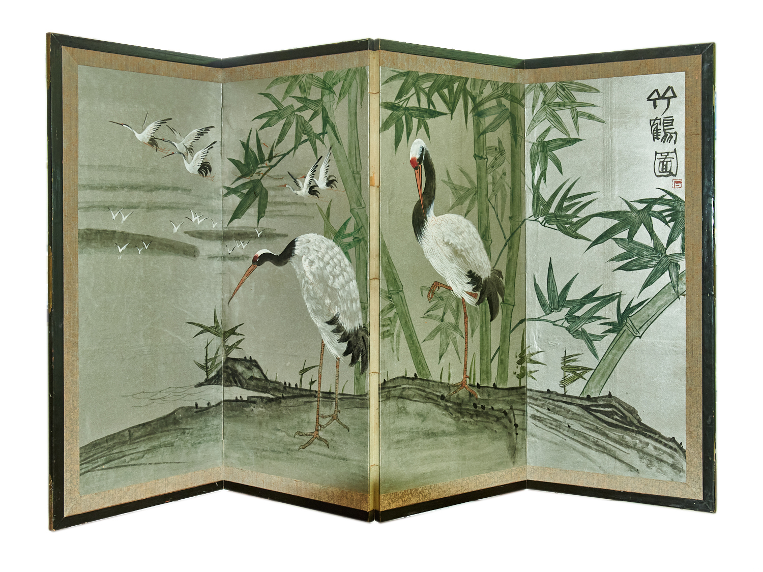 A FOLDING SCREEN WITH PAINTED CRANE DECORATION H.90.5CM, LEONARD JOEL LOCAL DELIVERY: MEDIUM