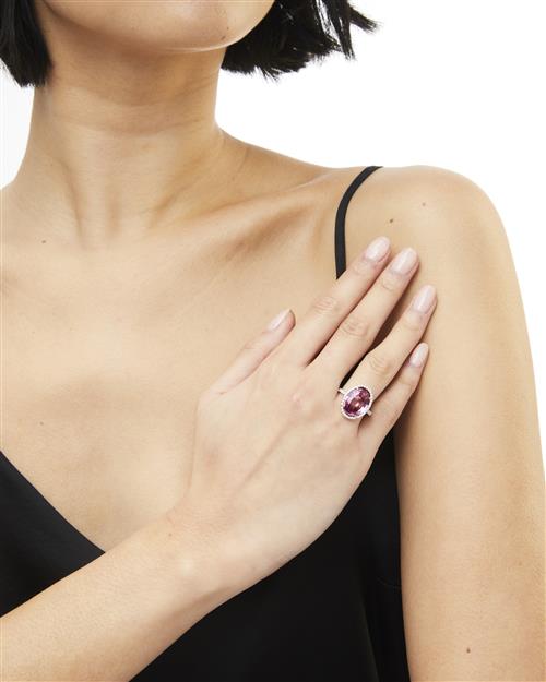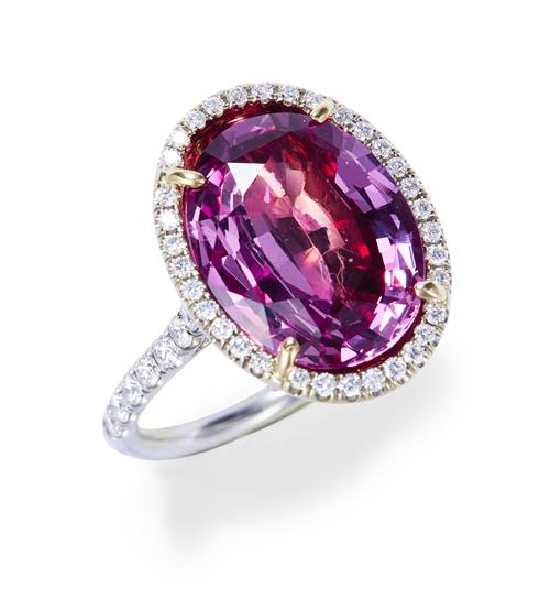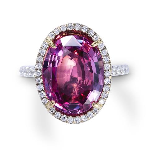 Of cluster design, centring a claw-set oval pink spinel weighing approximately 6.01 carats, framed by a halo of brilliant-cut diamonds, to shoulders pavé-set with diamonds, the diamonds together weighing approximately 0.45 carats, mounted in 18ct gold, size K1/2.