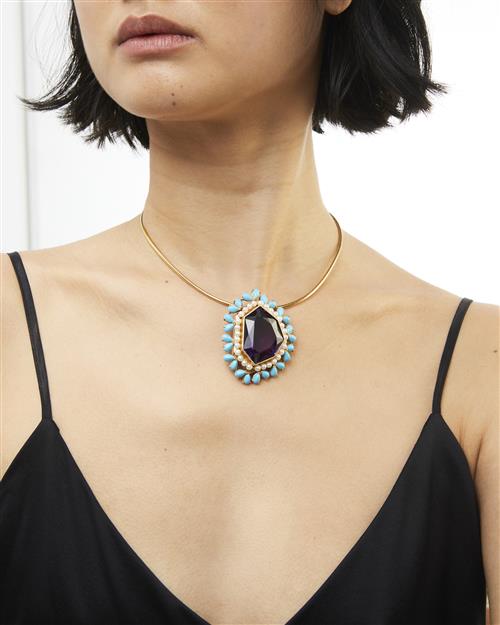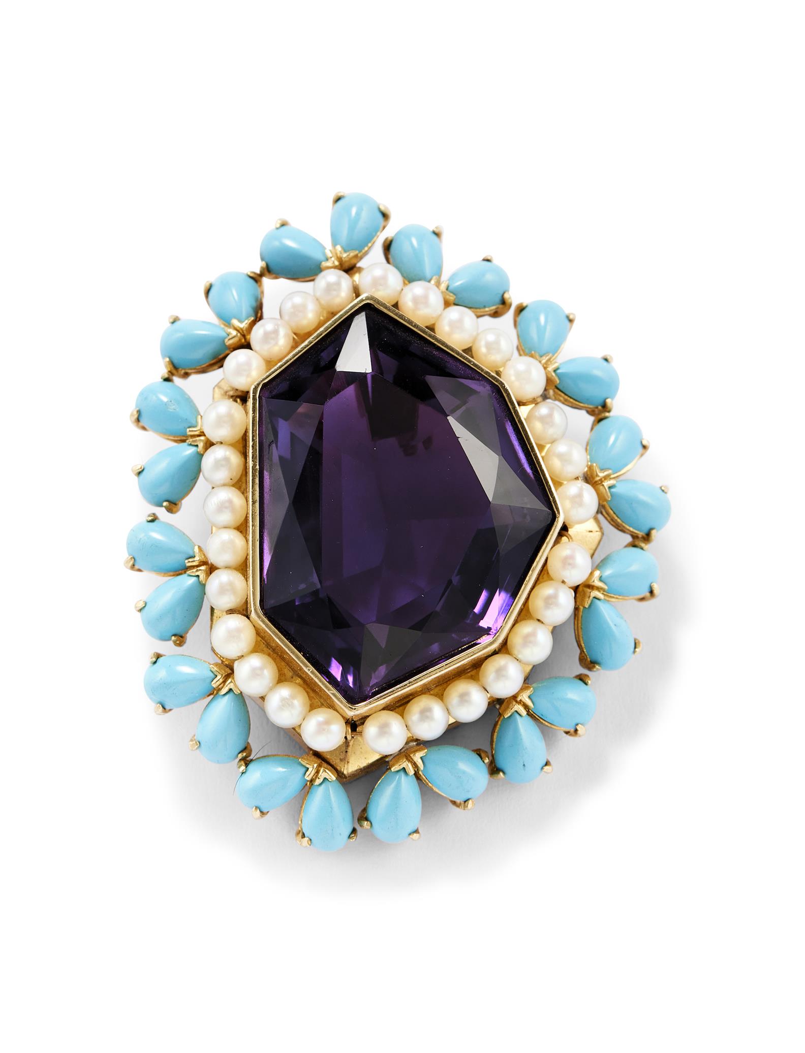Centring a collet-set heptagon-shaped amethyst framed by a line of seed pearls further bordered by an openwork surround claw-set with pear-shaped turquoise, mounted in 14ct gold, width 40mm, length 50mm.