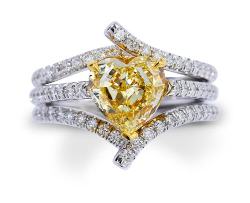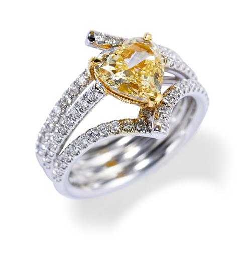 The fancy yellow heart brilliant-cut diamond weighing 2.71 carats, is claw-set between openwork shoulders pavé-set with brilliant-cut diamonds, the small diamonds together weighing approximately 0.86 carats, mounted in 18ct white gold, size M1/2.