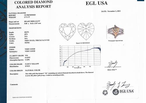 Accompanied by an EGL report numbered US90676301D, dated 1 November 2012, stating that the 2.71 carat diamond is natural, fancy yellow colour, VS1 clarity.