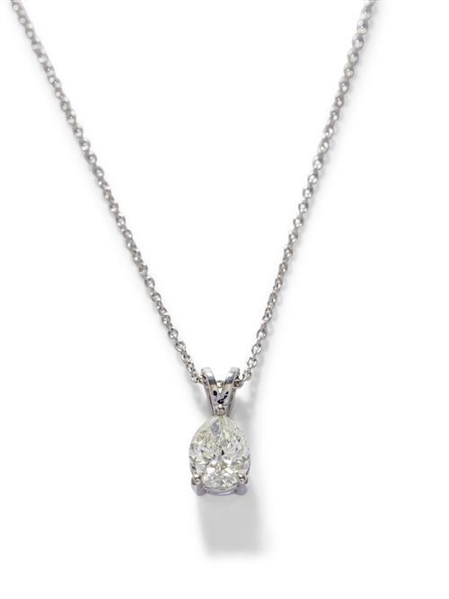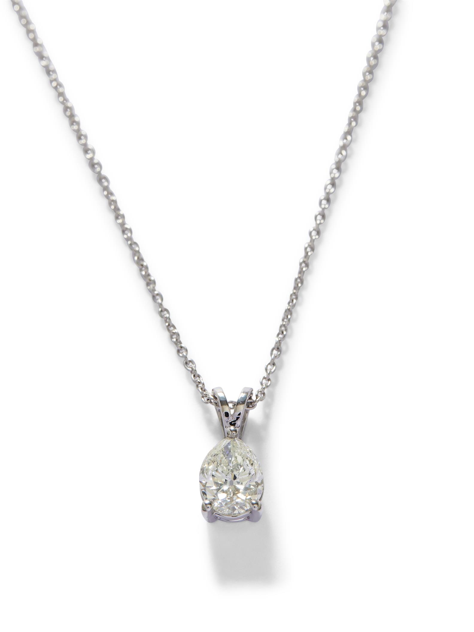 The claw-set pear brilliant-cut diamond weighing 1.21 carats, is completed by a fine trace chain, mounted in 18ct white gold, circumference 400mm.