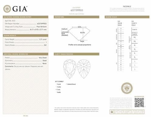 Accompanied by a GIA report numbered 6227399553, dated 8 April 2022, stating that the 1.21 carat diamond is natural, I colour, SI2 clarity.