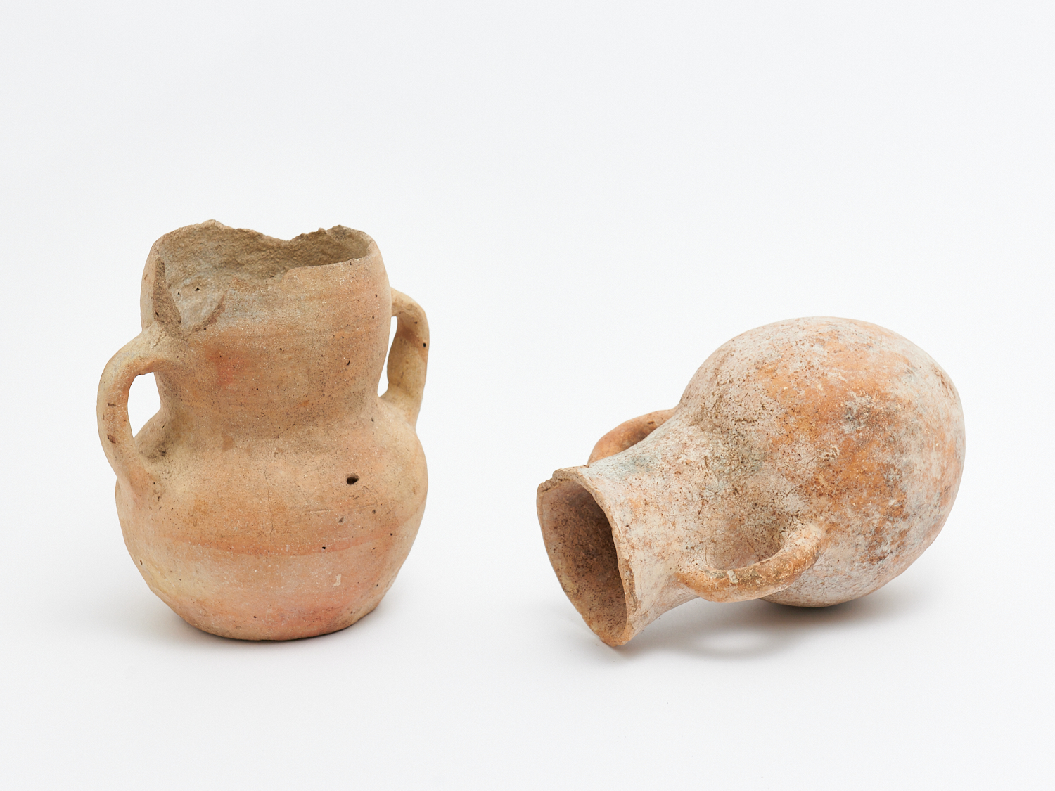 TWO ANTIQUE VESSELS (A/F) L.24CM (LARGEST), LEONARD JOEL LOCAL DELIVERY: MEDIUM