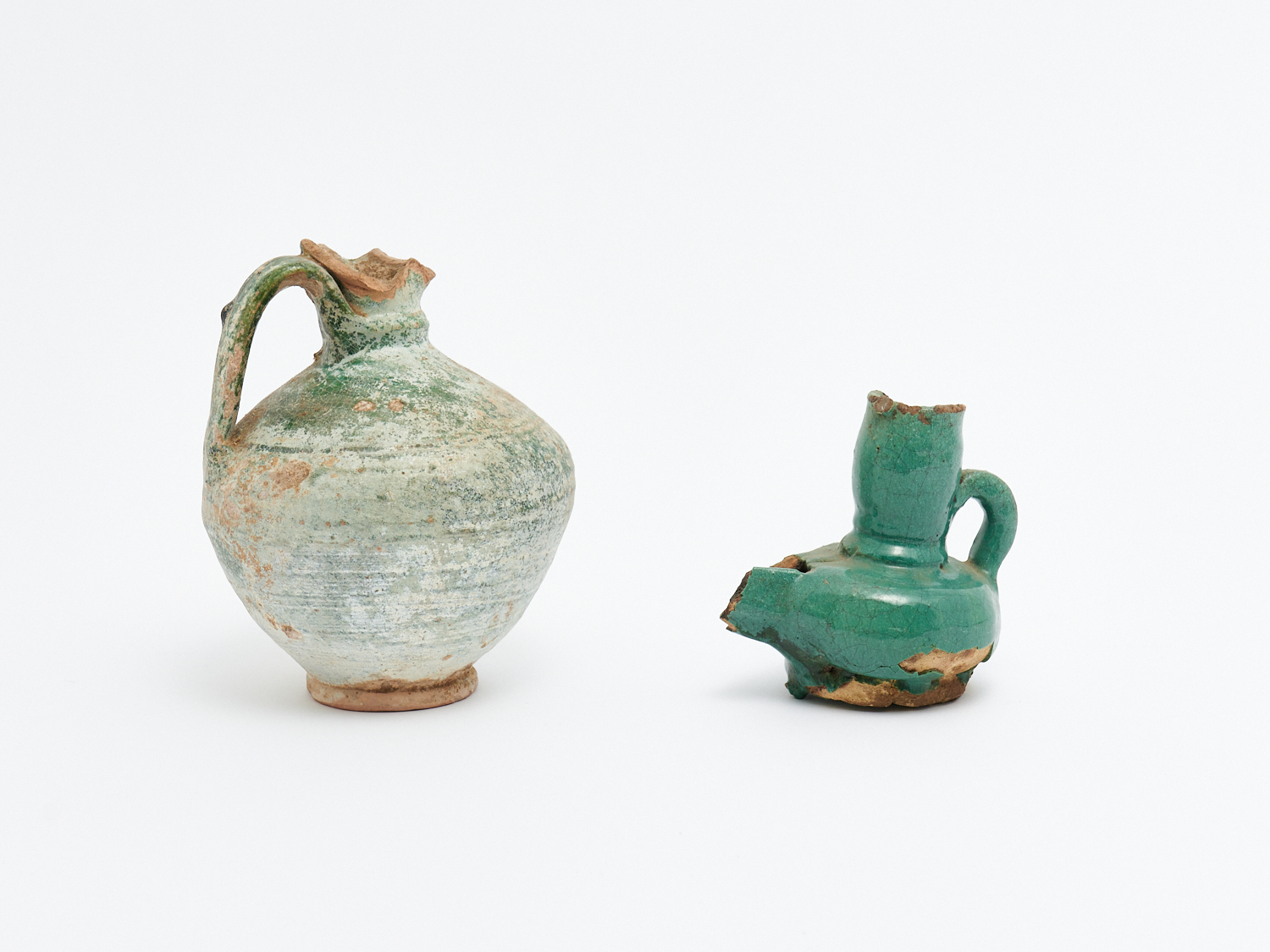 TWO GREEN GLAZED URN REMNANTS H.17CM (TALLEST), LEONARD JOEL LOCAL DELIVERY: SMALL