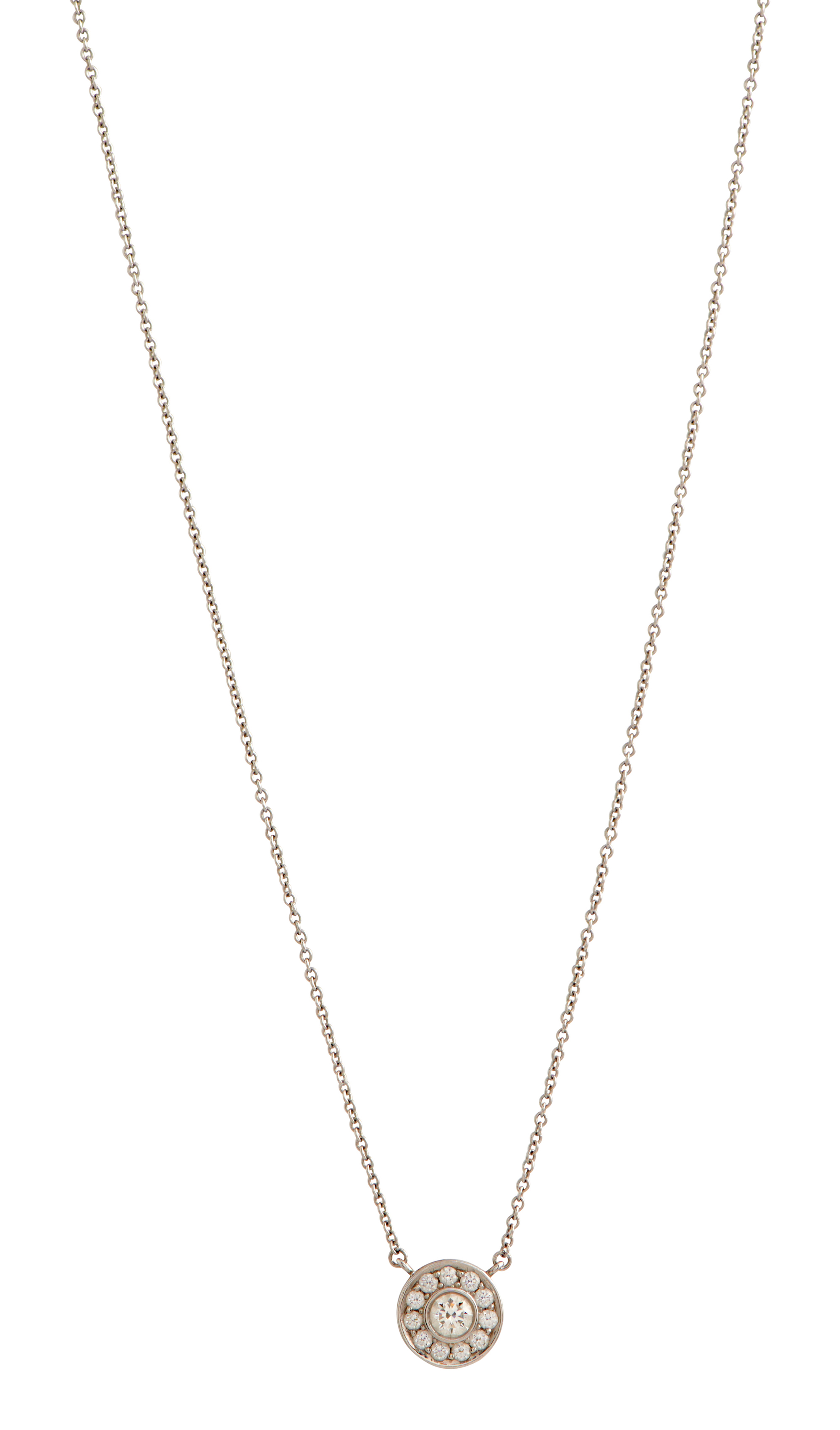 Centring a bezel-set brilliant-cut diamond, within a surround of ten further brilliant-cut diamonds together weighing approximately 0.26 carats, to an integral fine trace chain completed by a bolt ring clasp, signed Tiffany & Co., length approximately 500mm.