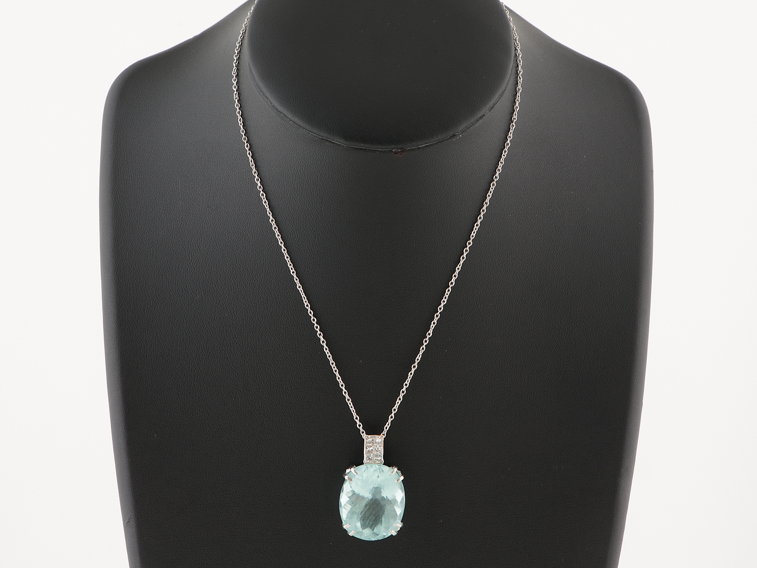 AN AQUAMARINE AND DIAMOND PENDANT NECKLACE IN 18CT WHITE GOLD, THE AQUAMARINE WEIGHING 33.36CTS, THE DIAMONDS TOTALLING 0.80CTS, LENGTH 430MM, APPROXIMATE WEIGHT 14.48GMS