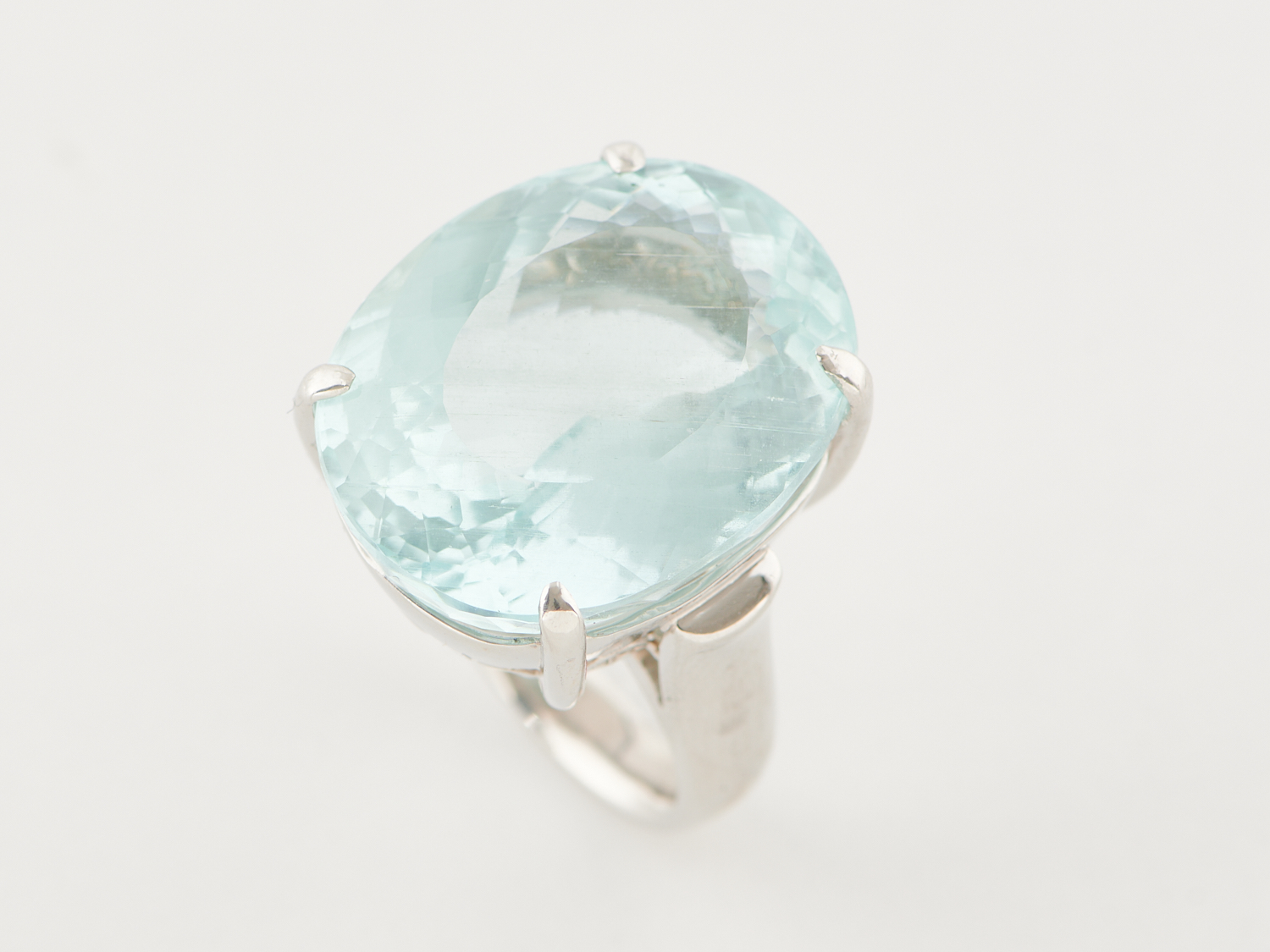 AN AQUAMARINE RING IN PLATINUM, THE AQUAMARINE WEIGHING 28.48CTS, RING SIZE L, WEIGHT 21.9GMS