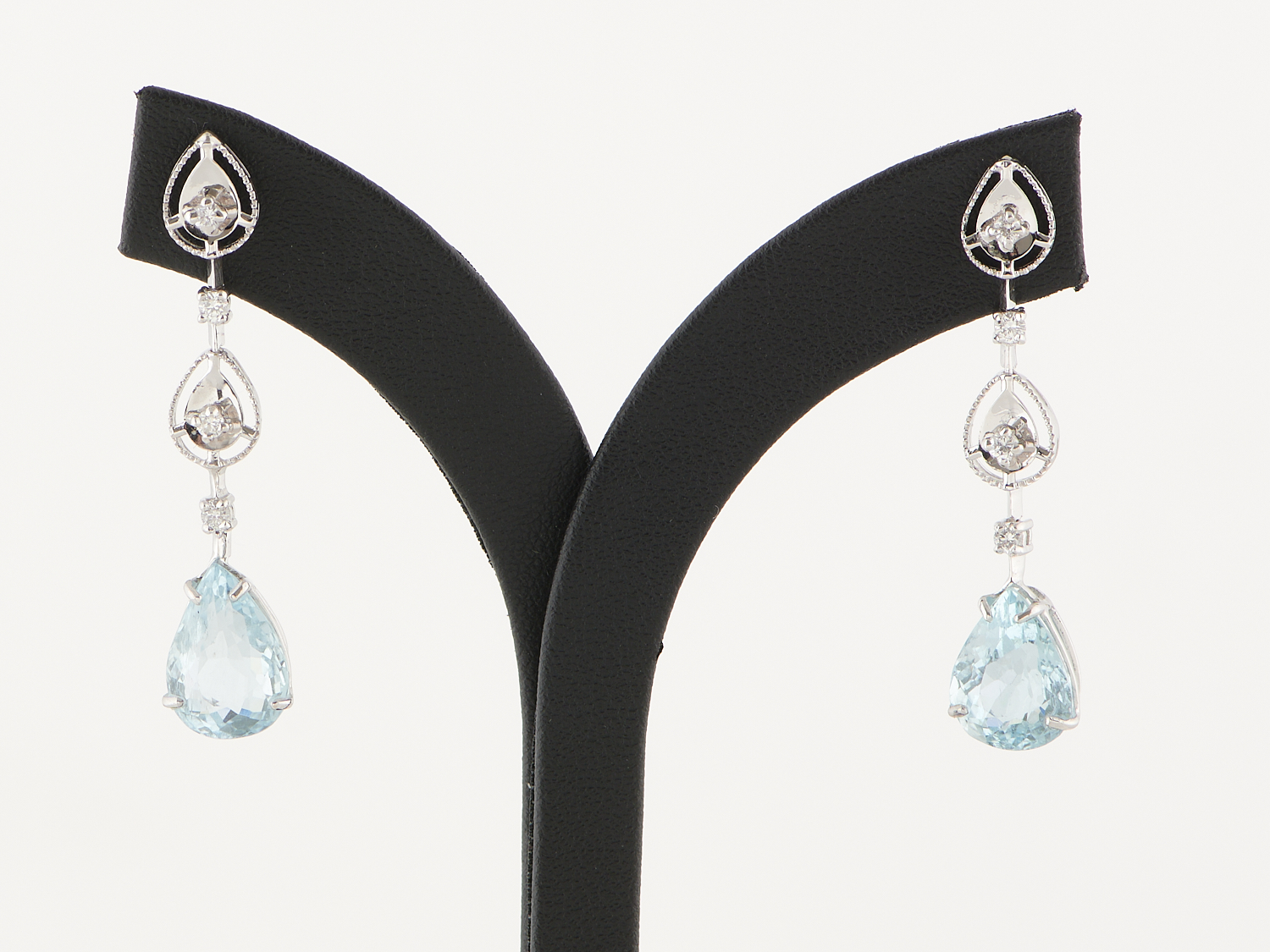 A PAIR OF AQUAMARINE AND DIAMOND DROP EARRINGS IN 18CT WHITE GOLD, TO POST AND BUTTERFLY FITTINGS, THE AQUAMARINES TOTALLING 8.74CTS, THE DIAMONDS TOTALLING 0.36CTS, EARRING SIZE 9 X 45MM, APPROXIMATE WEIGHT 5.89GMS