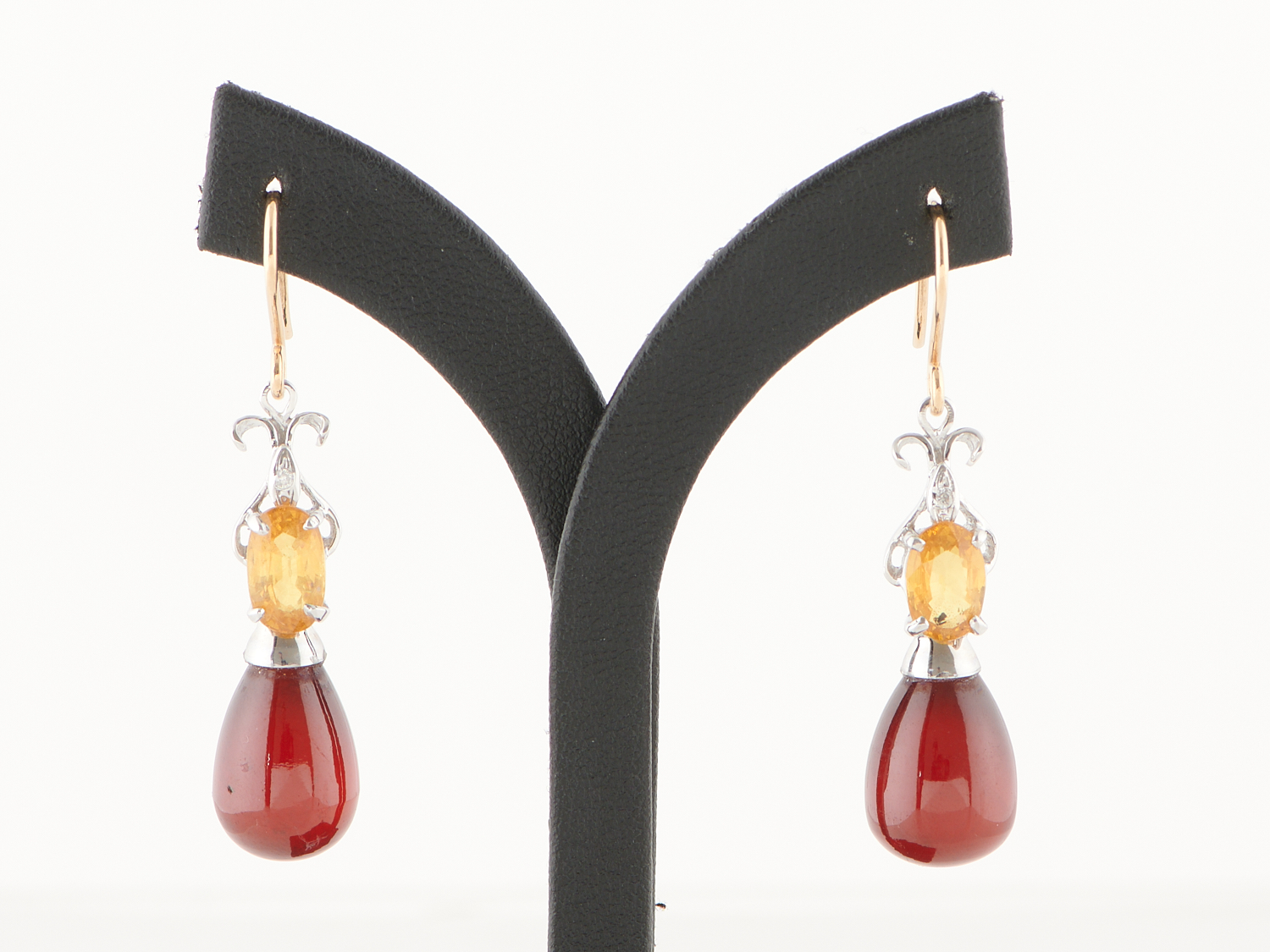 A PAIR OF GARNET AND SAPPHIRE DROP EARRINGS IN 18CT TWO-TONE GOLD, THE GARNETS TOTALLING 34.88CTS, WITH SAPPHIRES TOTALLING 3.94CTS, TO SHEPHERD HOOK FITTINGS, 48MM, 11.31GMS