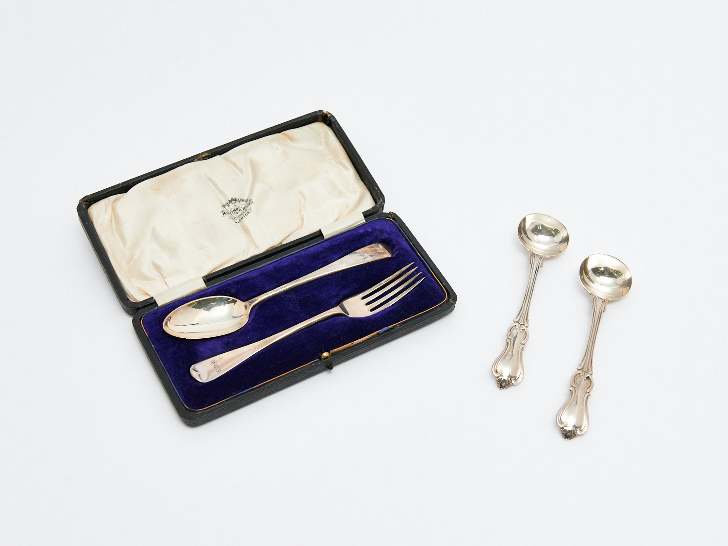 TWO STERLING SILVER MUSTARD SPOONS TOGETHER WITH CASED SPOON AND FORK, LEONARD JOEL LOCAL DELIVERY: SMALL