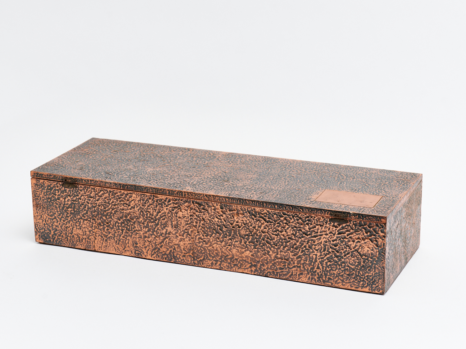 A COPPER TABLE BOX, VELVET LINED H.11CM X W.53CM X D.18.5CM, LEONARD JOEL LOCAL DELIVERY: MEDIUM