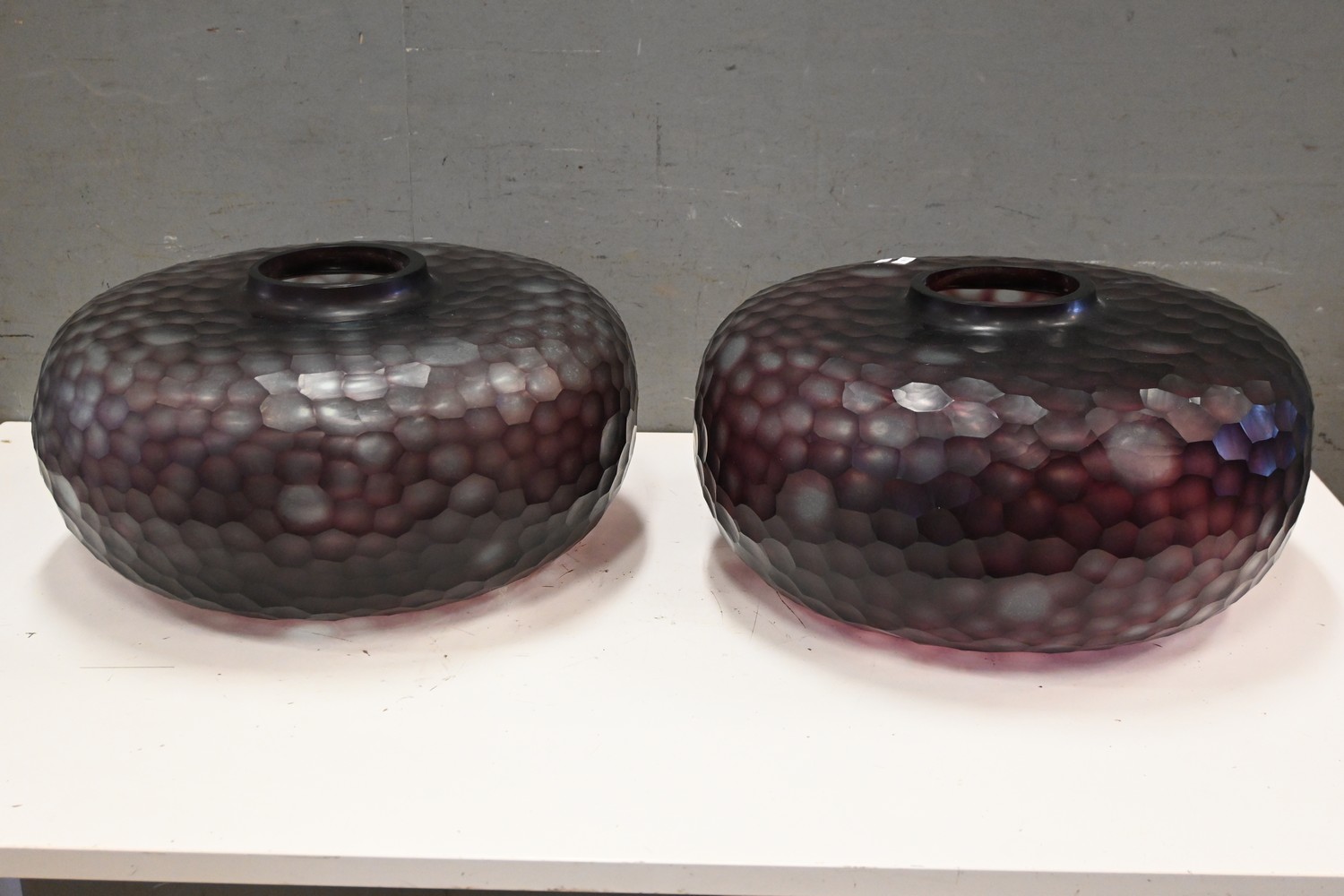 A PAIR OF PURPLE HAND CHISELED GLASS VASES (A/F) (24H X 47D CM) (LEONARD JOEL DELIVERY SIZE: MEDIUM)