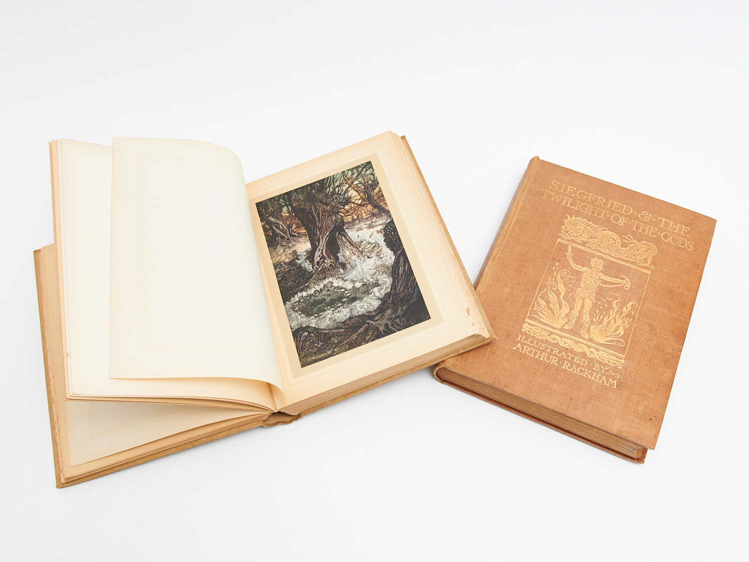 TWO BOOKS ILLUSTRATED BY ARTHUR RACKMAN INCLUDING A MIDSUMMER-NIGHT'S DREAM BY WILLIAM SHAKESPEARE, 1908 AND SIEGFRIED AND THE TWILIGHT OF THE GODS BY RICHARD WAGNER H.25.5CM, LEONARD JOEL LOCAL DELIVERY: MEDIUM