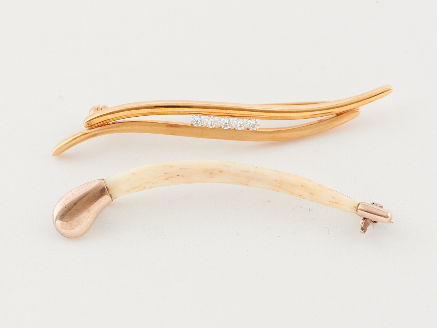 A WHITE SAPPHIRE SET BROOCH, LENGTH 62MM, AND A BONE BROOCH, LENGTH 60MM, BOTH IN 9CT GOLD, TOTAL WEIGHT 7.3GMS