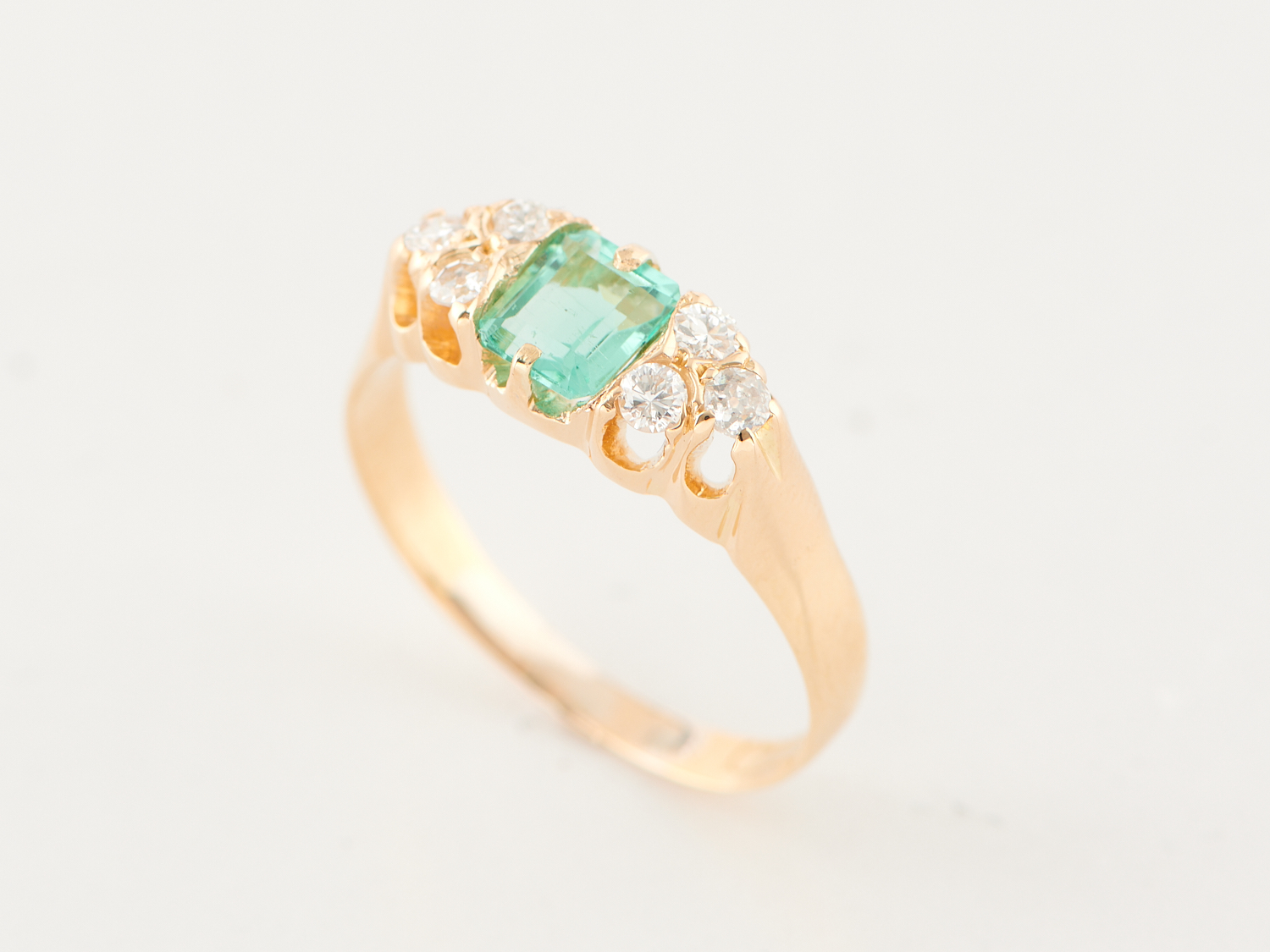 AN EMERALD AND OLD EUROPEAN CUT DIAMOND RING IN 18CT GOLD, RING SIZE R, APPROXIMATE WEIGHT 3.94GMS