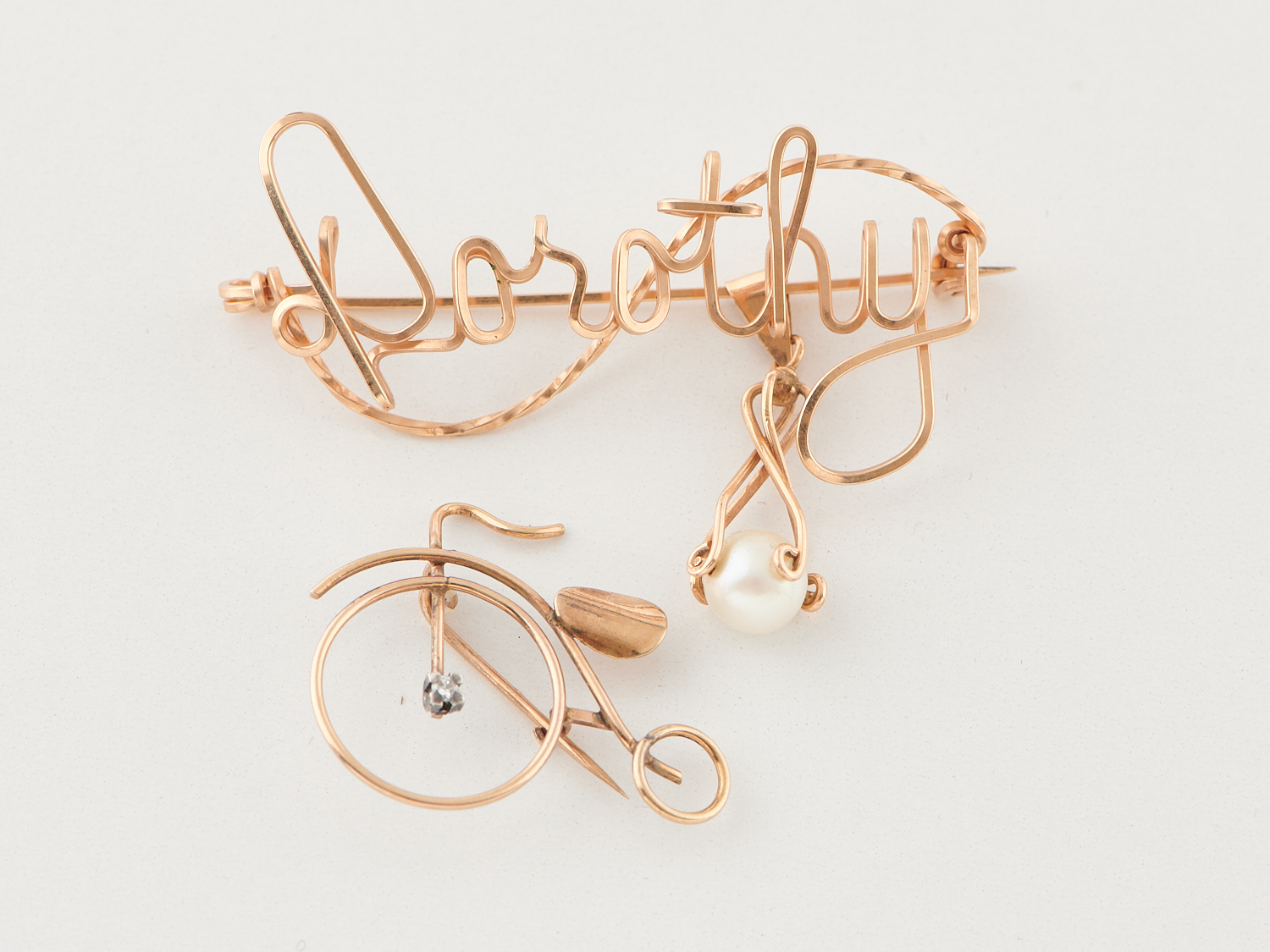 A PENNY FARTHING BROOCH IN 9CT GOLD, 1.3GMS, A PEARL PENDANT IN 14CT GOLD, 1.3GMS, AND A DOROTHY BROOCH IN GOLD PLATE