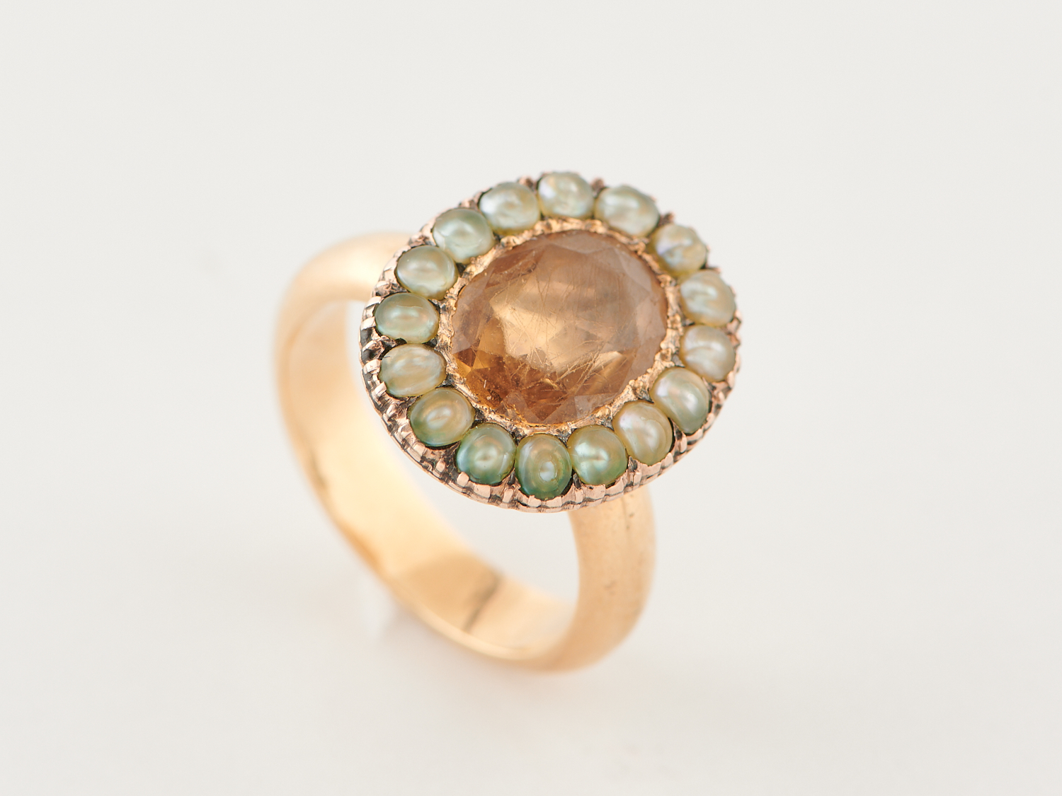 A GEORGIAN SEED PEARL AND CITRINE RING IN 14CT GOLD, RING SIZE N, 7.14GMS