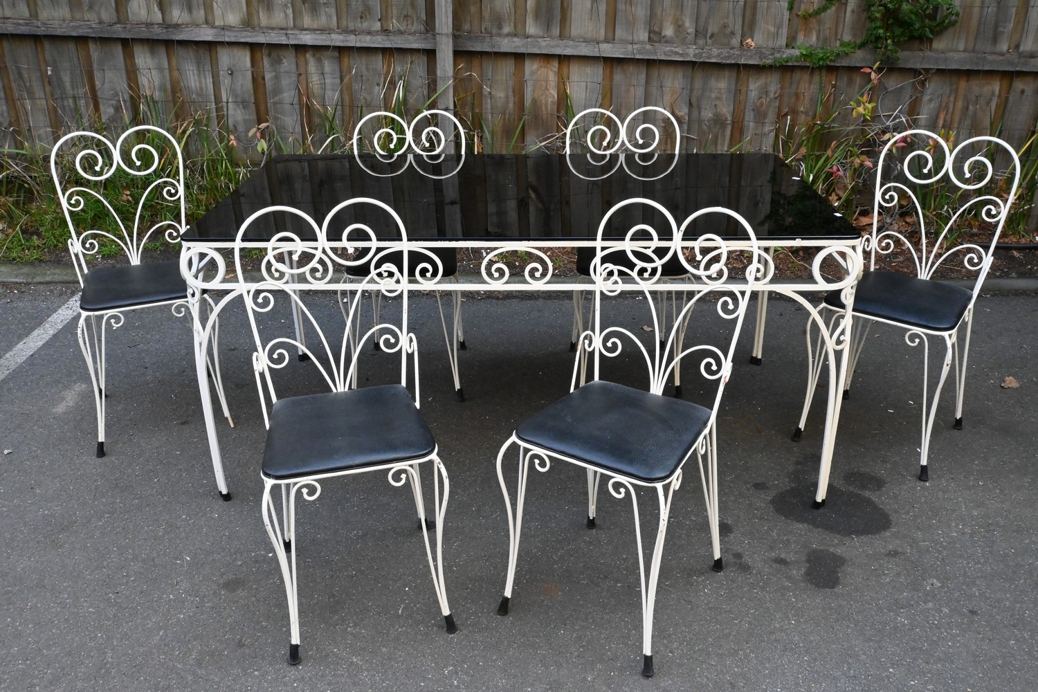 A 1960s PAINTED CAST IRON BLACK GLASS TOPPED DINING TABLE WITH SIX MATCHED CHAIRS (78H X 170W X 92D CM) (A/F) (PLEASE NOTE THIS HEAVY ITEM MUST BE REMOVED BY CLIENTS OR CARRIERS AT THE CUSTOMERS EXPENSE. LEONARD JOEL STAFF CANNOT ASSIST CARRYING THIS ITEM)