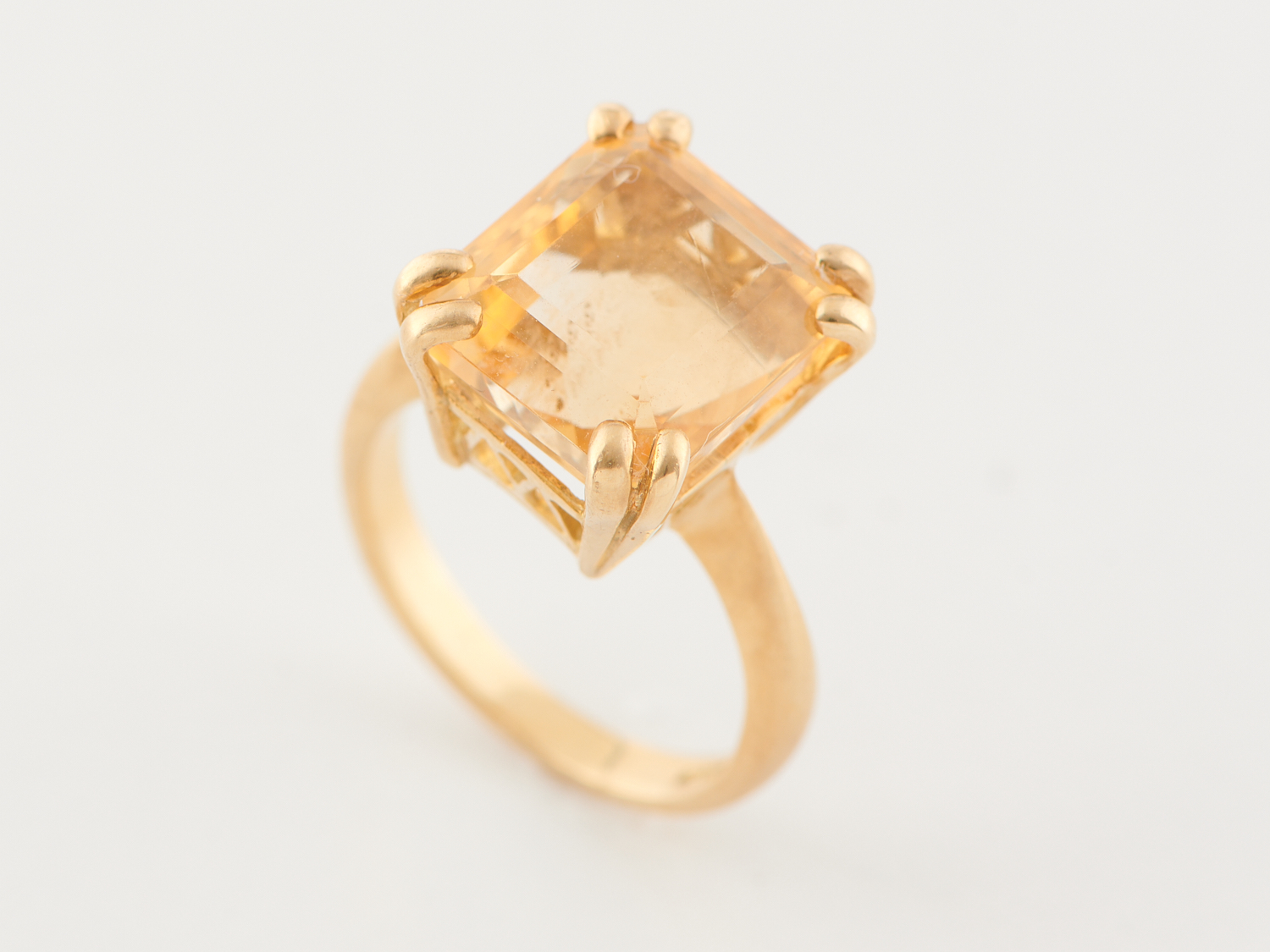 A CITRINE RING IN 18CT GOLD, THE NATURAL EMERALD CUT CITRINE WEIGHING APPROXIMATELY 6.0CTS, RING SIZE L/M, BIRMINGHAM HALLMARKS, 6.67GMS
