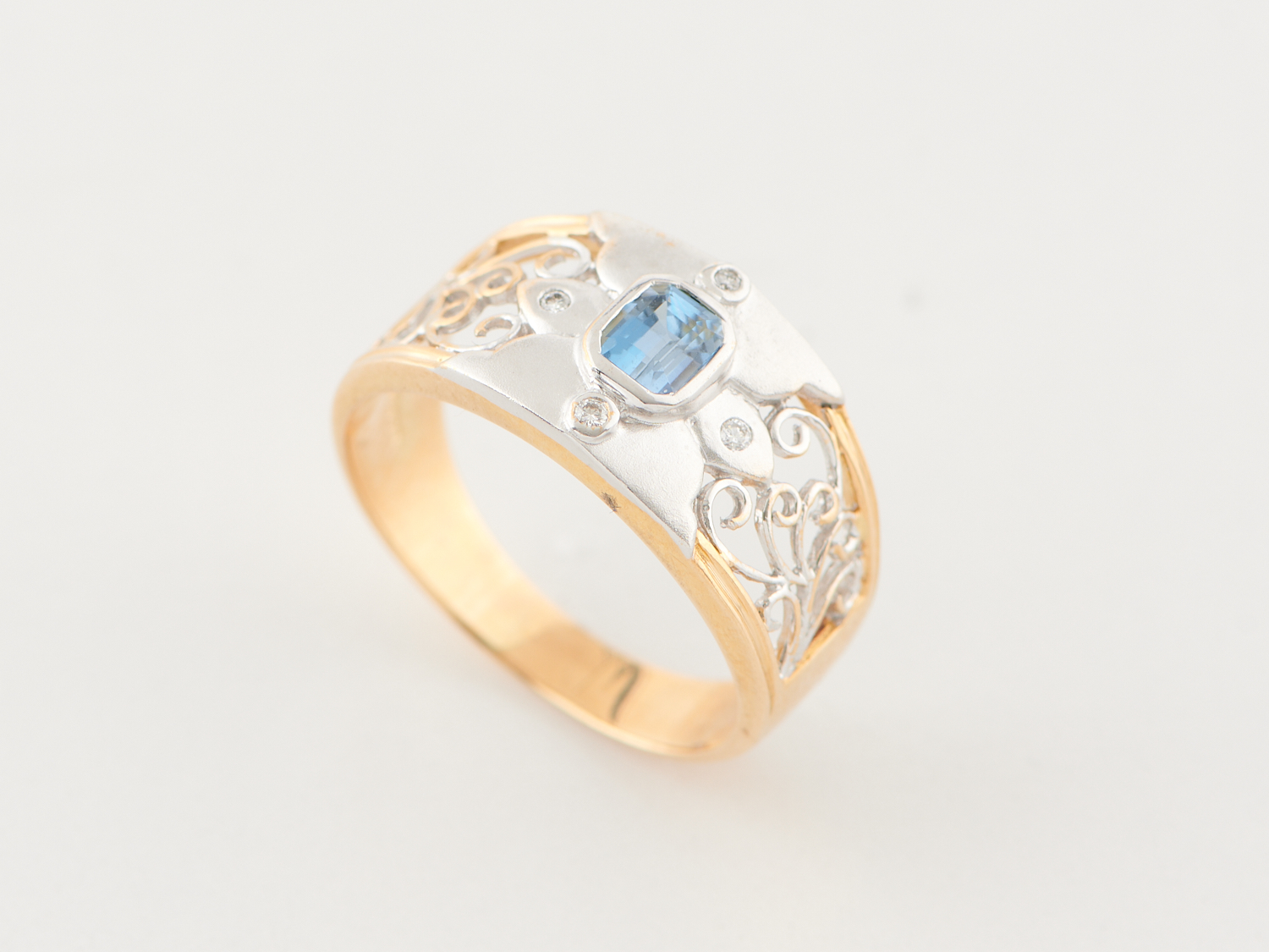 AN AQUAMARINE AND DIAMOND RING IN 18CT TWO TONE GOLD, RING SIZE N/O, 4.73GMS