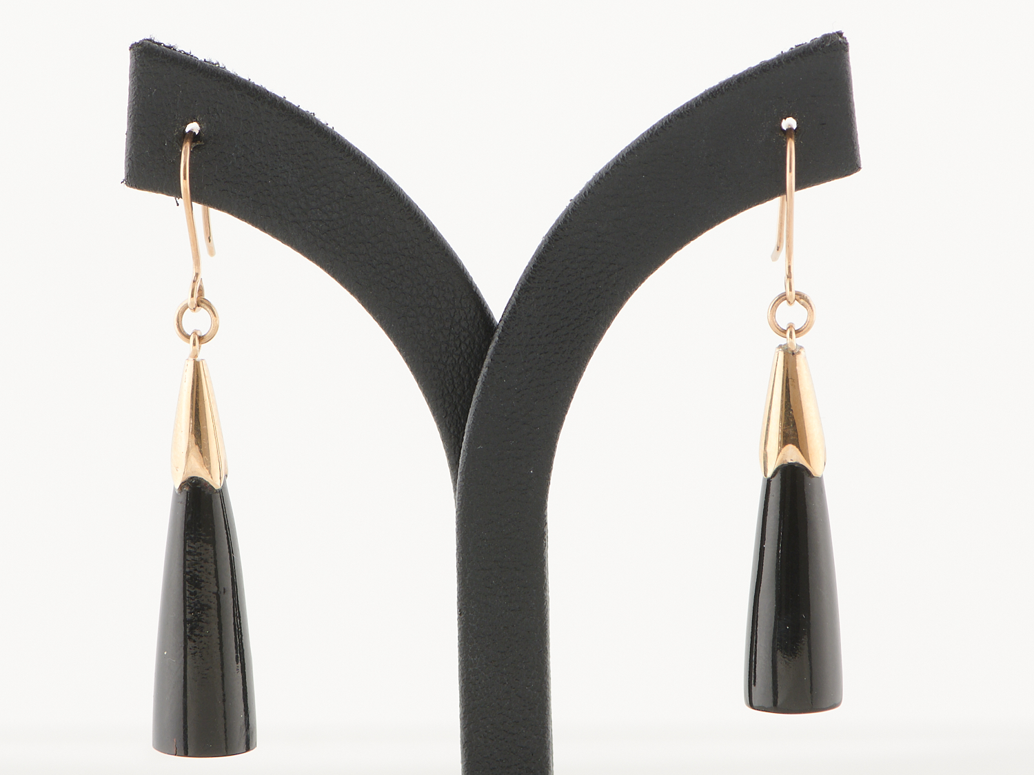 A PAIR OF TORTOISE SHELL EARRINGS IN 9CT GOLD, TO SHEPHERDS HOOK FITTINGS, DROP LENGTH APPROXIMATELY 45MM