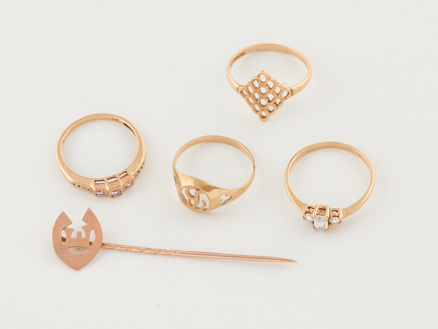A COLLECTION OF FOUR RINGS AND A STICK PIN IN 9CT GOLD, ONE PINK SAPPHIRE AND DIAMOND SET, AND ONE PASTE SET, SIZES N, O, Q, TOTAL WEIGHT APPROXIMATELY 6.92GMS