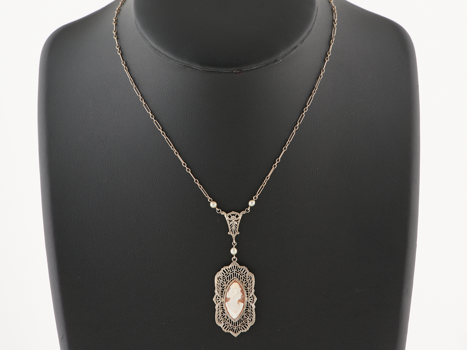A CAMEO PENDANT NECKLACE IN 10CT WHITE GOLD, PENDANT SIZE 18 X 57MM, NECKLACE LENGTH 370MM, APPROXIMATE WEIGHT 5.04GMS