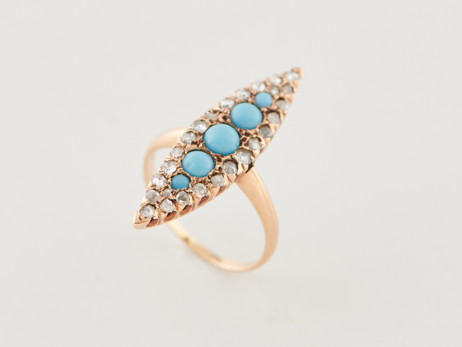 AN ANTQIUE TURQUOISE AND DIAMOND RING IN 12CT ROSE GOLD CIRCA 1890, APPROXIMATE RING SIZE K-L, APPROXIMATE WEIGHT 3.02GMS