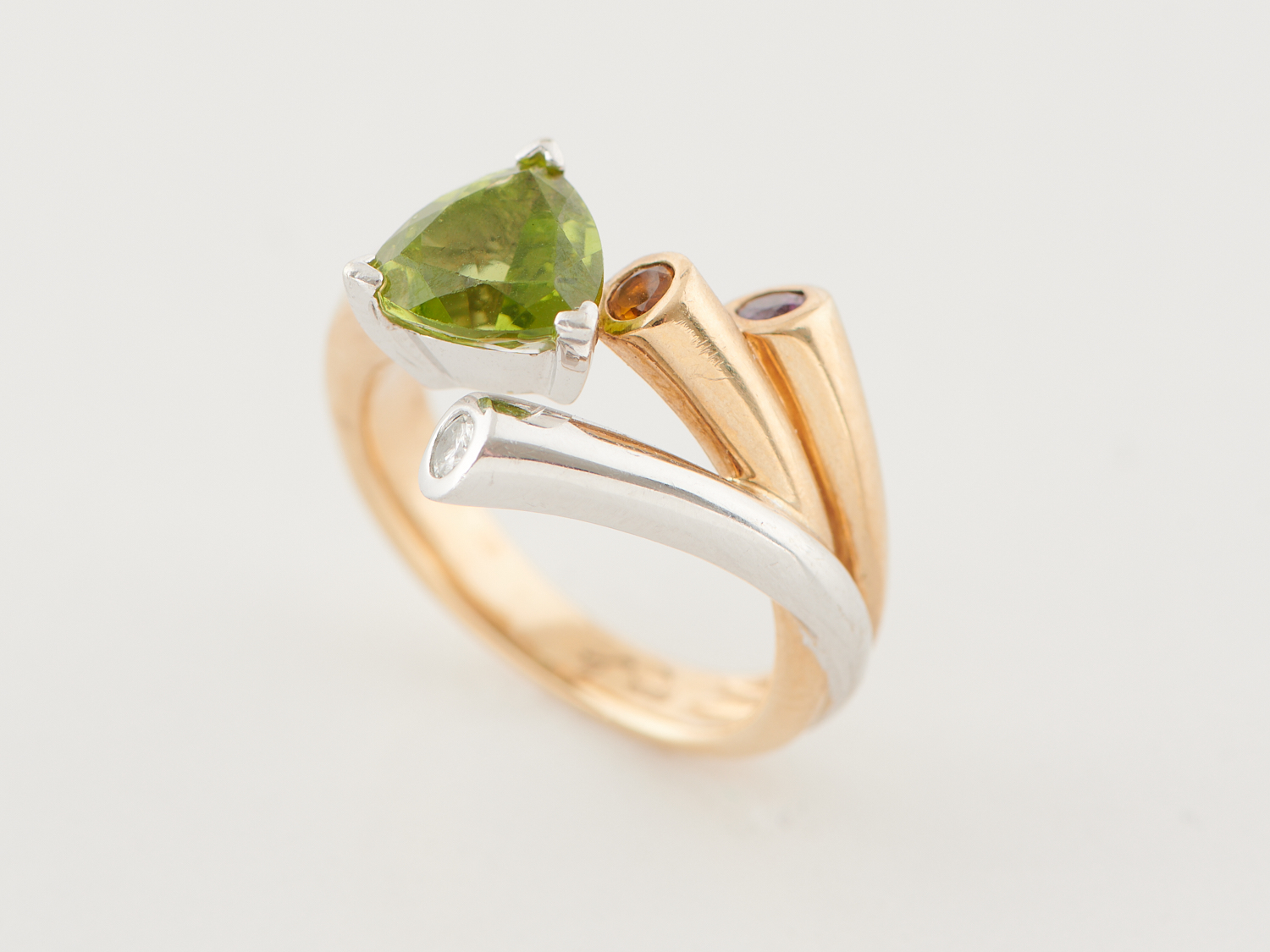 A MODERNIST GEM-SET RING INCLUDING PERIDOT, CITRINE, DIAMOND AND GARNET IN 9CT GOLD, SIZE M-N, 8.0GMS
