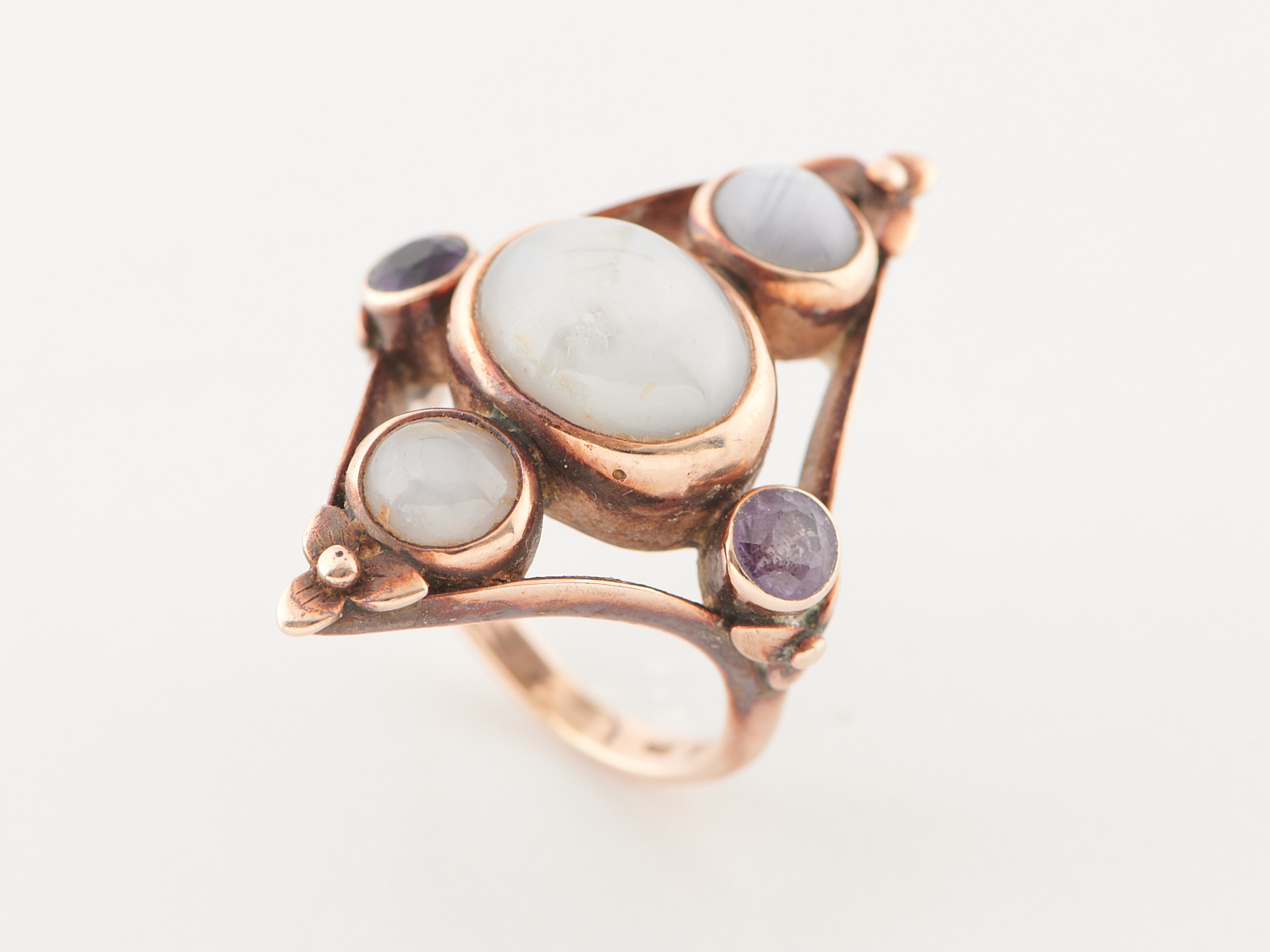 A GEM-SET OPEN WORK RING IN 9CT ROSE GOLD, COMPRISING MOONSTONE AND AMETHYST, RING SIZE L, 12.11GMS