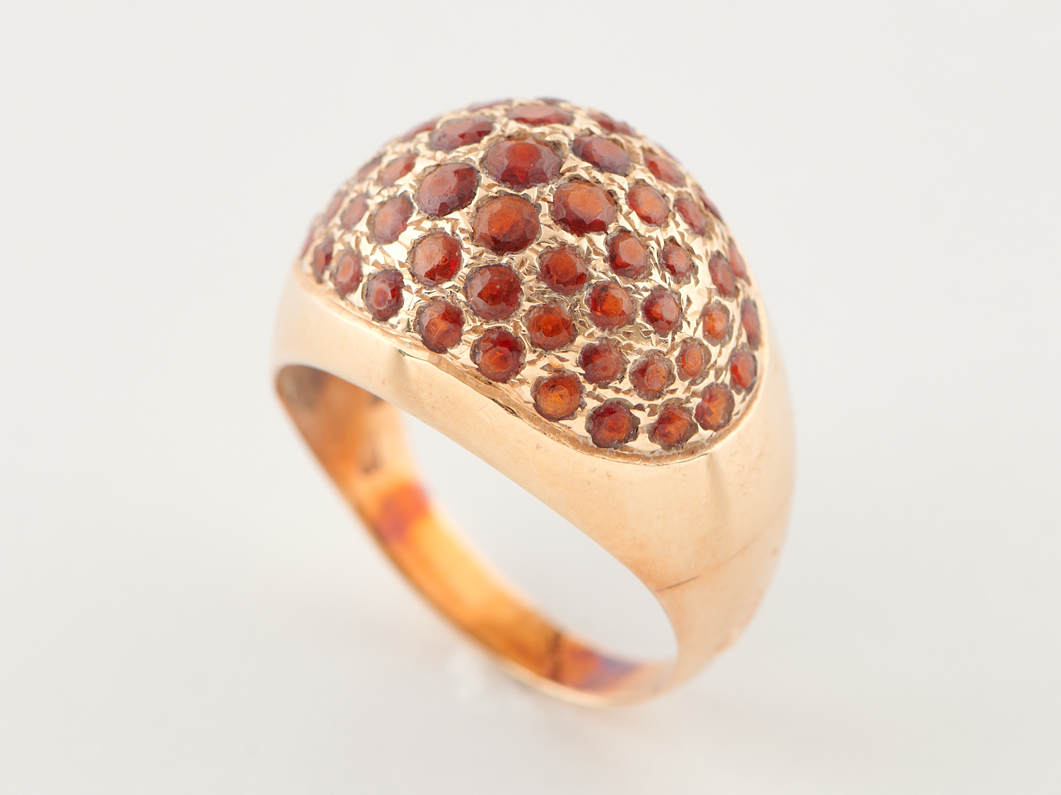A PAVE GARNET RING IN 14CT GOLD, RING SIZE S/T, 5.33GMS