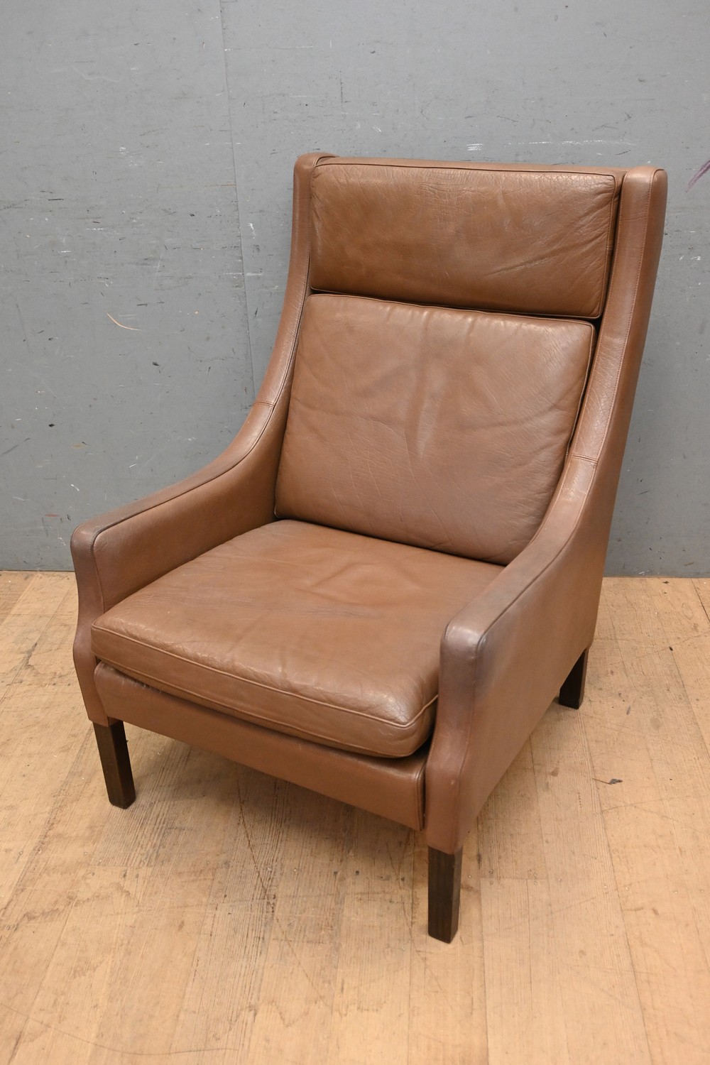 A MID-CENTURY DANISH LEATHER ARMCHAIR WITH ROSEWOOD LEGS (99H X 69W X 89D CM) (LEONARD JOEL DELIVERY SIZE: X-LARGE)