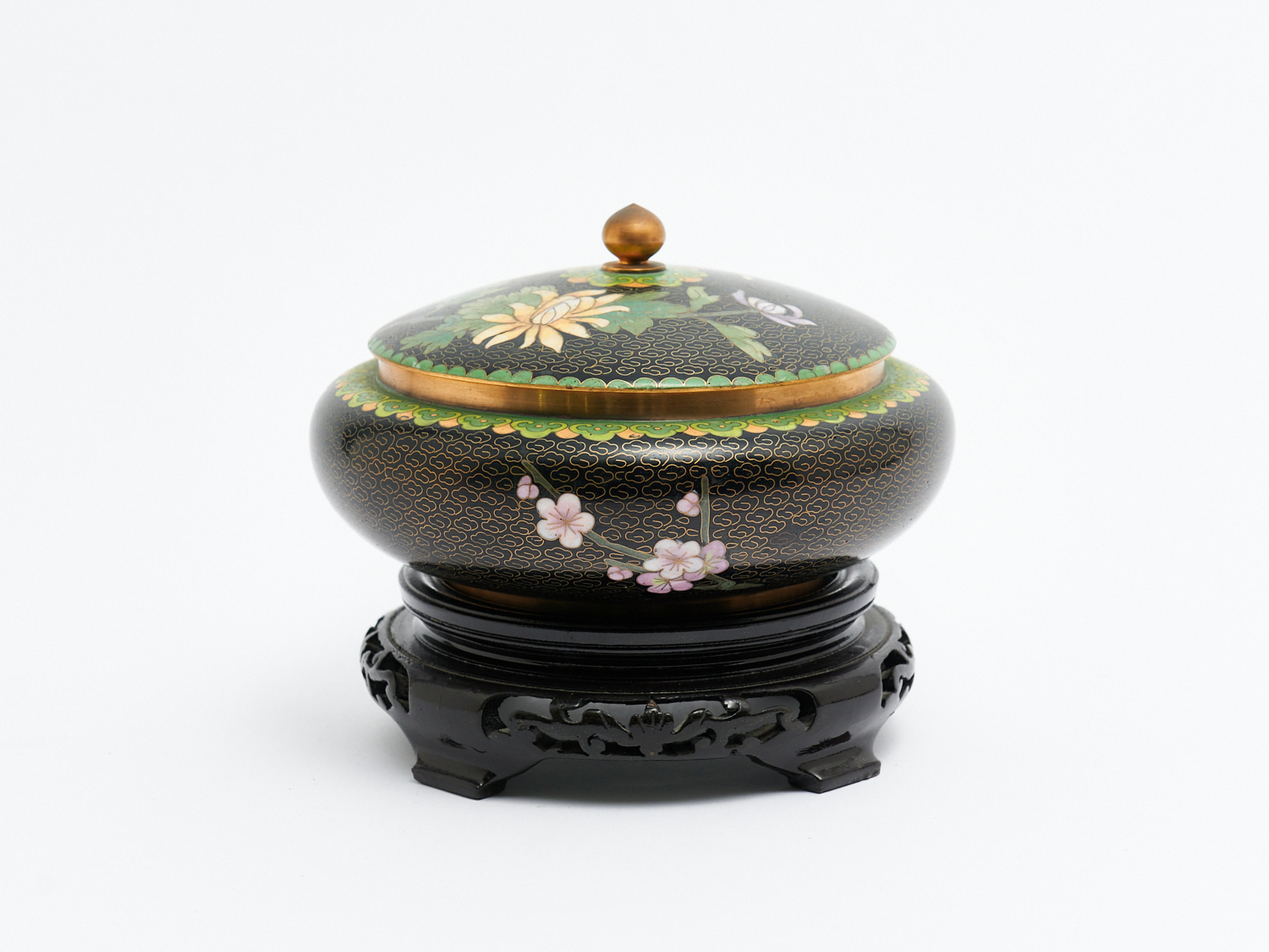 A BLACK GROUND CLOISONNE LIDDED BOWL ON CARVED ROSEWOOD BASE, DIA.16.5CM, LEONARD JOEL LOCAL DELIVERY: MEDIUM