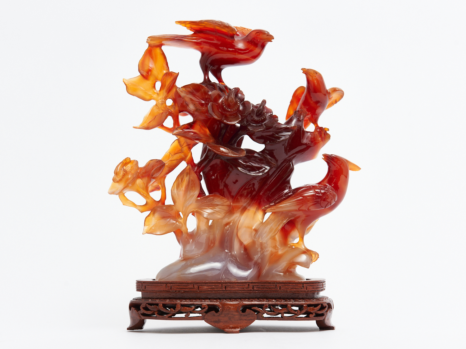 A CHINESE CARVED HARDSTONE BIRD AND FLOWER GROUP ON ROSEWOOD BASE, H.24CM, LEONARD JOEL LOCAL DELIVERY: MEDIUM