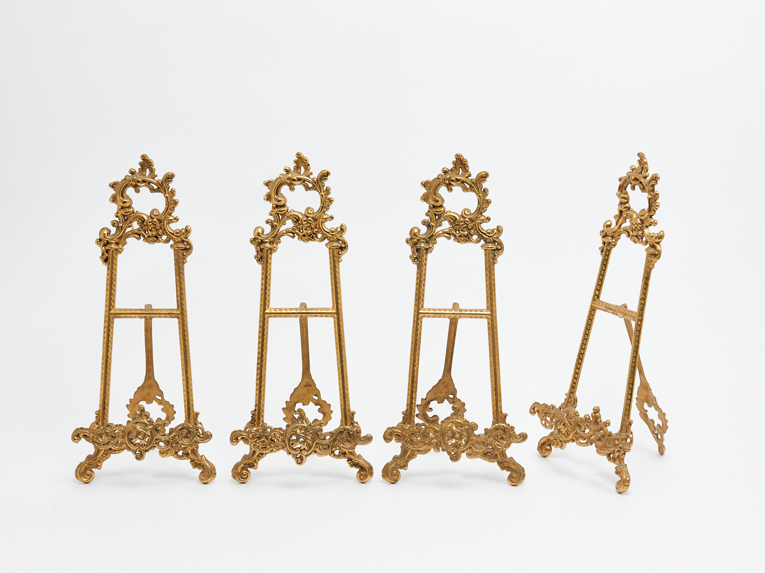 FOUR MID CENTURY ITALIAN BRASS MINIATURE EASEL PICTURE STANDS, H.41CM, LEONARD JOEL LOCAL DELIVERY: MEDIUM