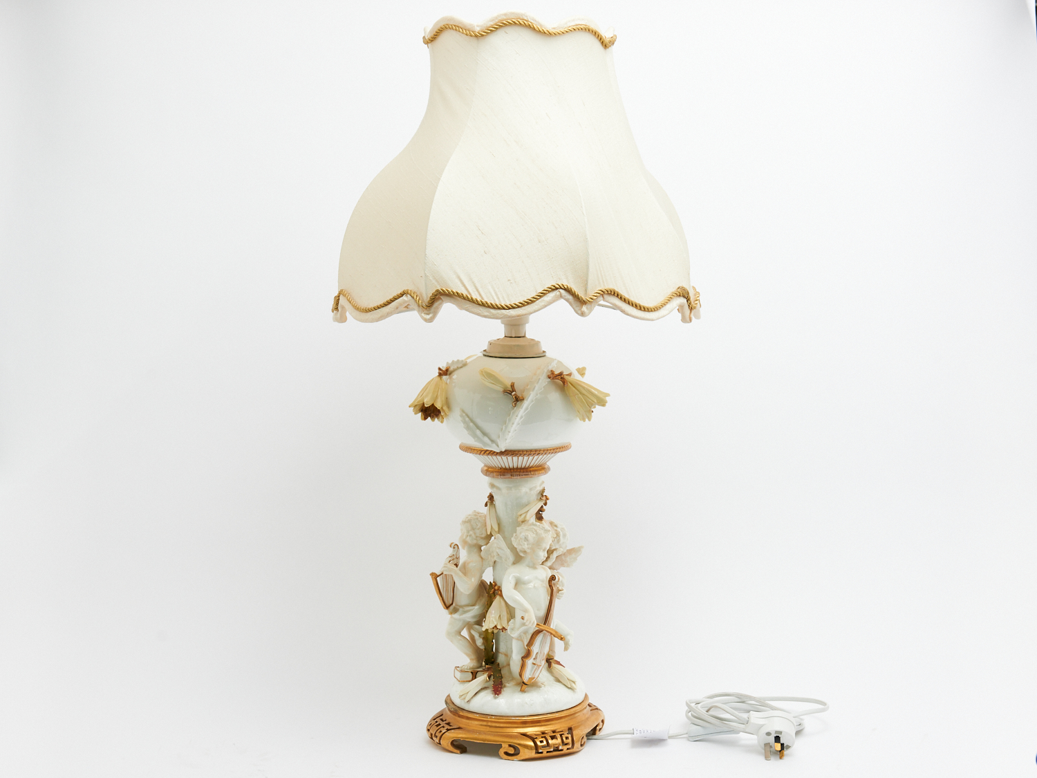 AN ENGLISH MOORE BROTHERS CHERUB ADORNED FIGURAL OIL LAMP CONVERTED TO ELECTRIC LAMP, H.54.5CM, LEONARD JOEL LOCAL DELIVERY: MEDIUM