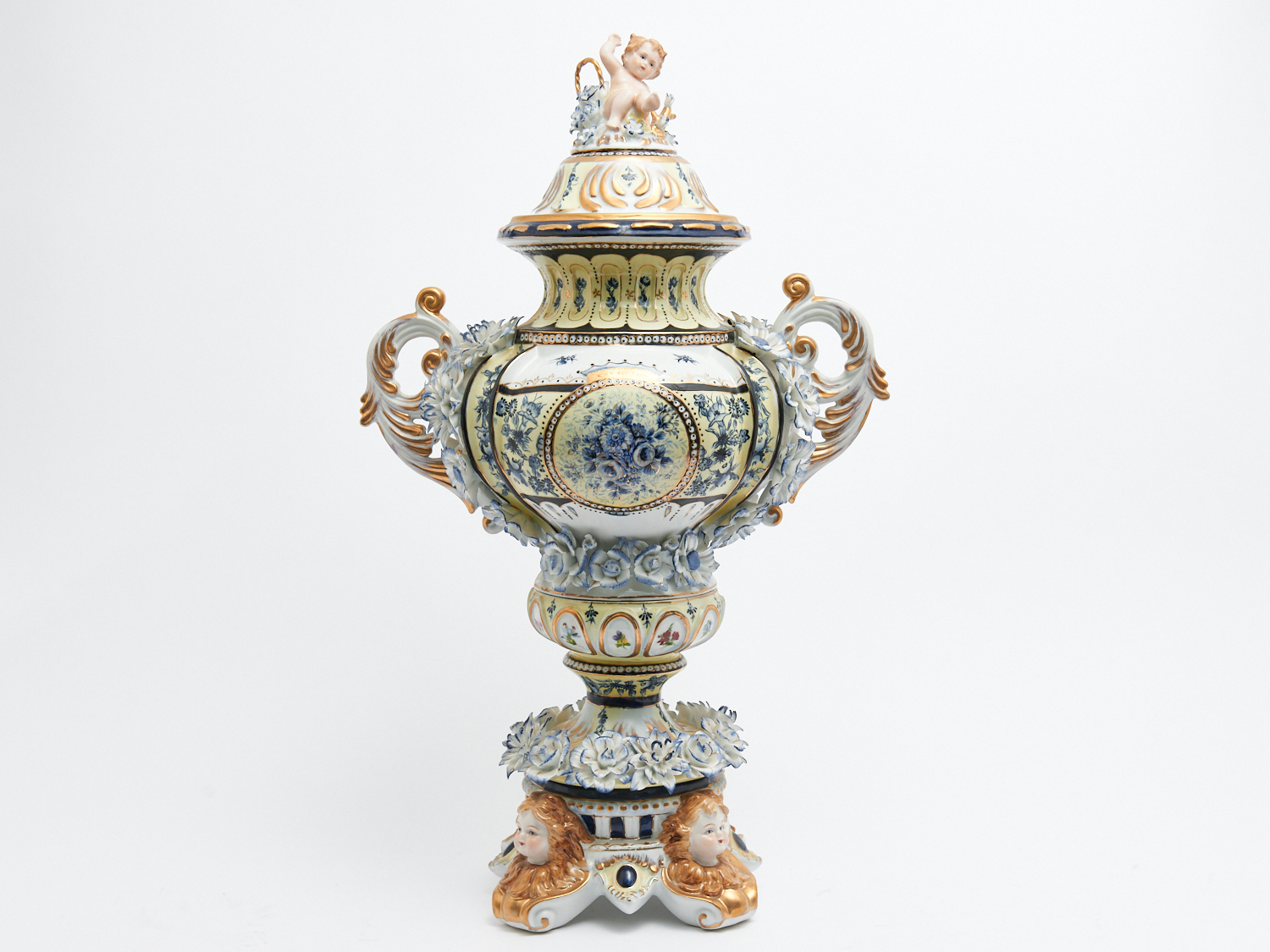 A GILT DECORATED WINGED CHERUB ADORNED BLUE YELLOW AND WHITE FLORAL URN, H.66CM, LEONARD JOEL LOCAL DELIVERY: MEDIUM