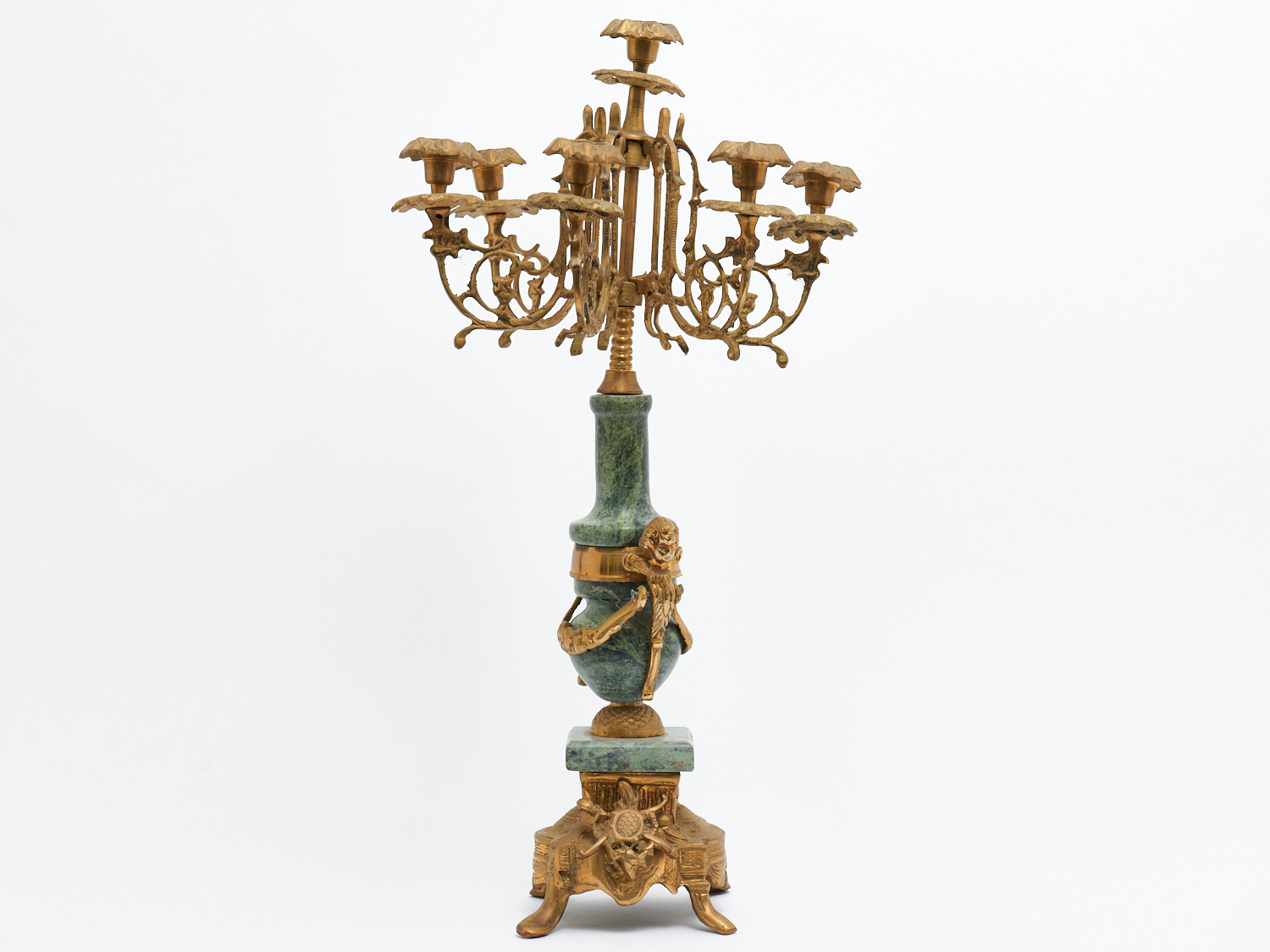 A MARBLE AND BRASS CHERUB DECORATED CANDELABRA, H.58CM, LEONARD JOEL LOCAL DELIVERY: MEDIUM