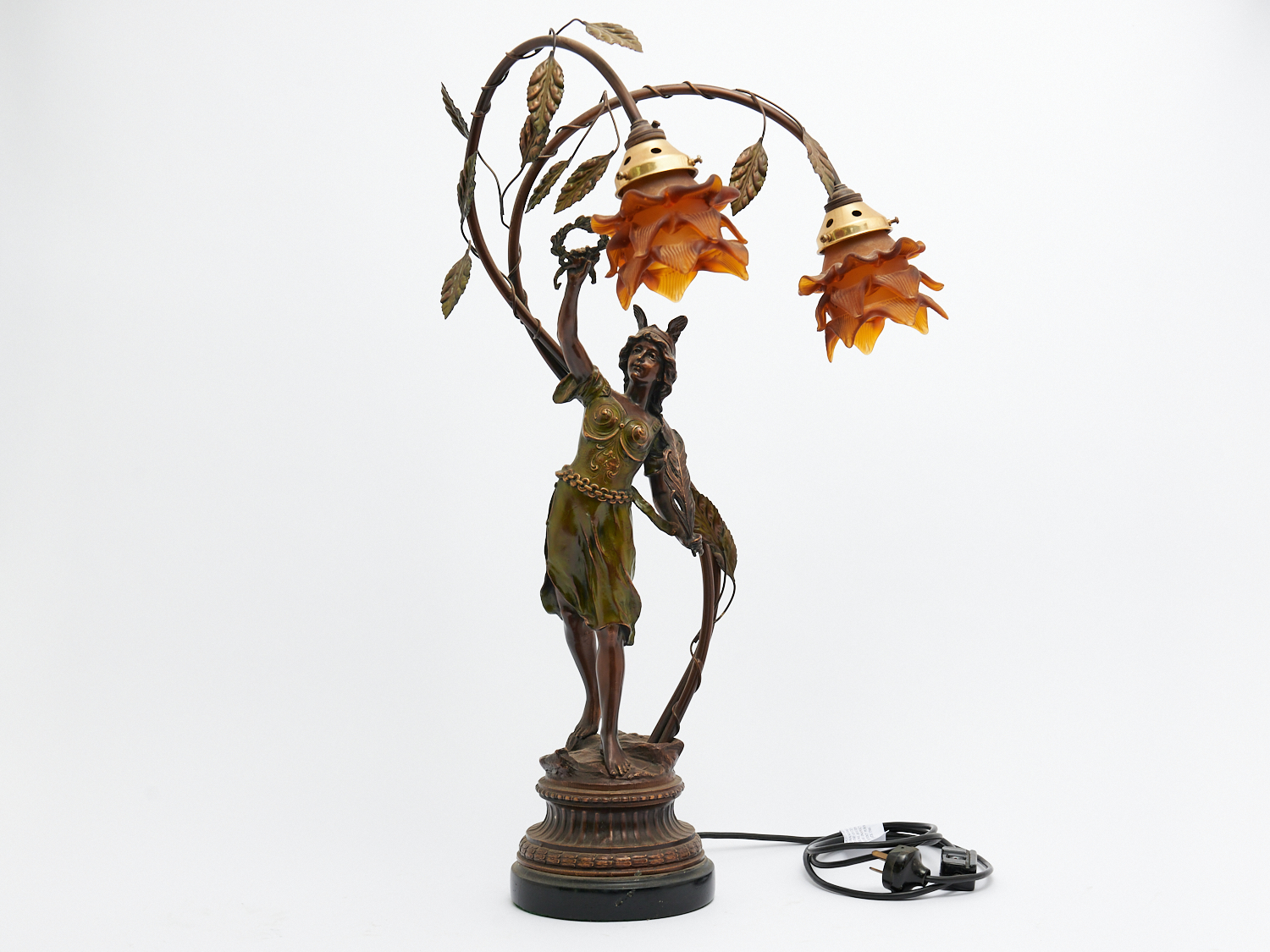 A MARBLE BASED BRONZED SPELTER FIGURAL LAMP WITH FLORAL DECORATED ARMS AND AMBER GLASS SHADES, H.71CM, LEONARD JOEL LOCAL DELIVERY: MEDIUM