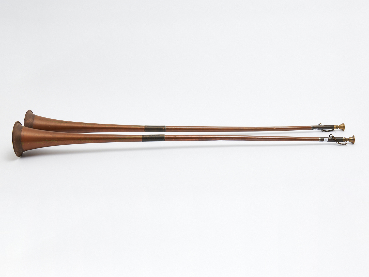 TWO 19TH CENTURY ENGLISH COPPER AND SILVER HUNTING HORNS, H.96.5CM, LEONARD JOEL LOCAL DELIVERY: MEDIUM