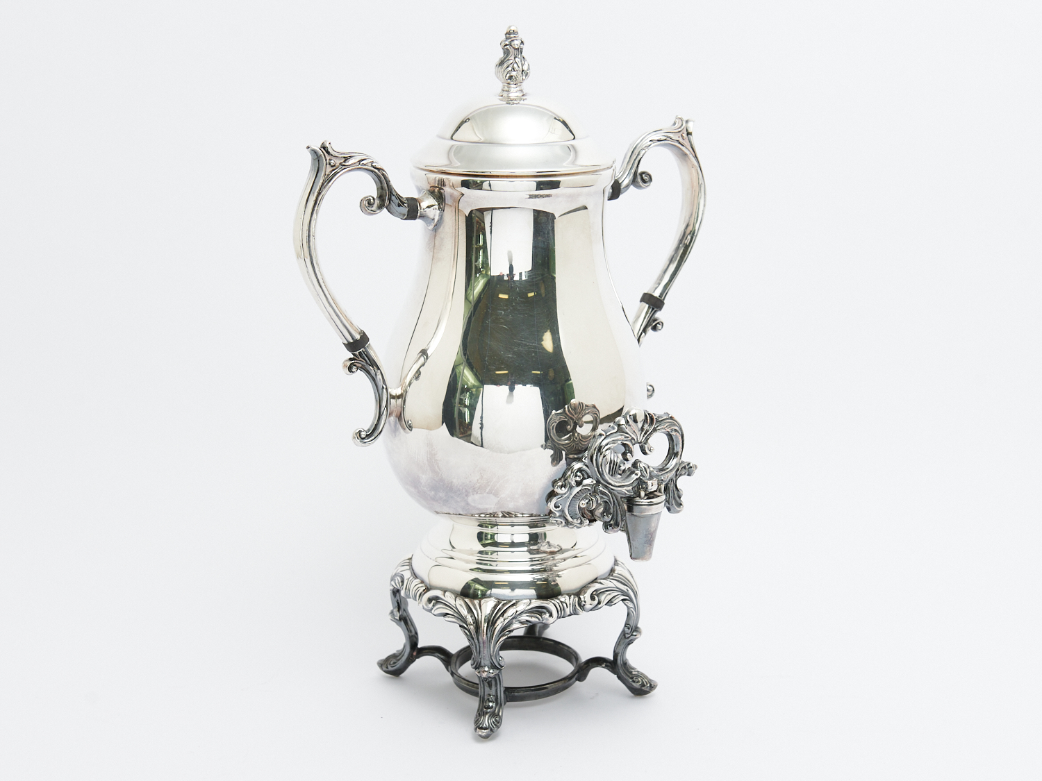 AN ENGLISH SILVER PLATED TWO HANDLED SPIRIT KETTLE ON STAND H.40CM, LEONARD JOEL LOCAL DELIVERY: MEDIUM