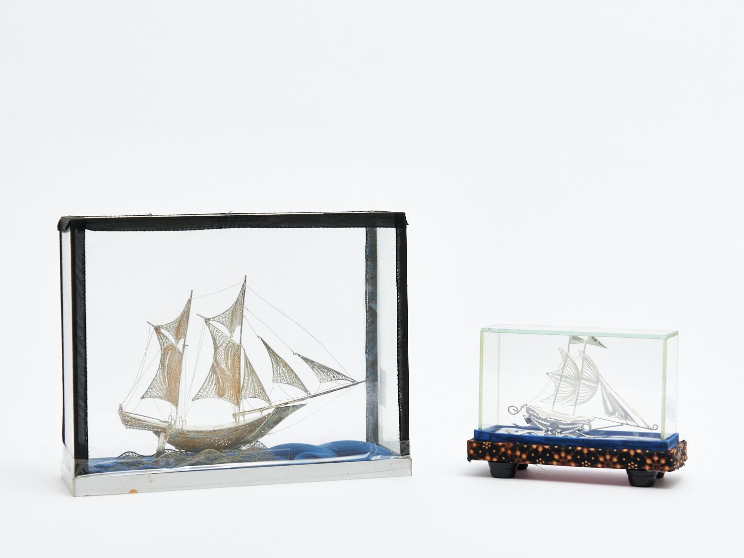 TWO ORIENTAL 925 STAMPED SILVER BOATS IN GLASS CASES(A/F) H.14.5CM X W.18CM (LARGEST), LEONARD JOEL LOCAL DELIVERY: SMALL