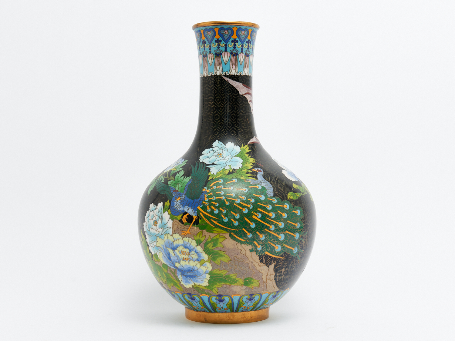 A CLOISONNE VASE WITH PEACOCK AND BAT DECORATION H.39.5CM, LEONARD JOEL LOCAL DELIVERY: MEDIUM