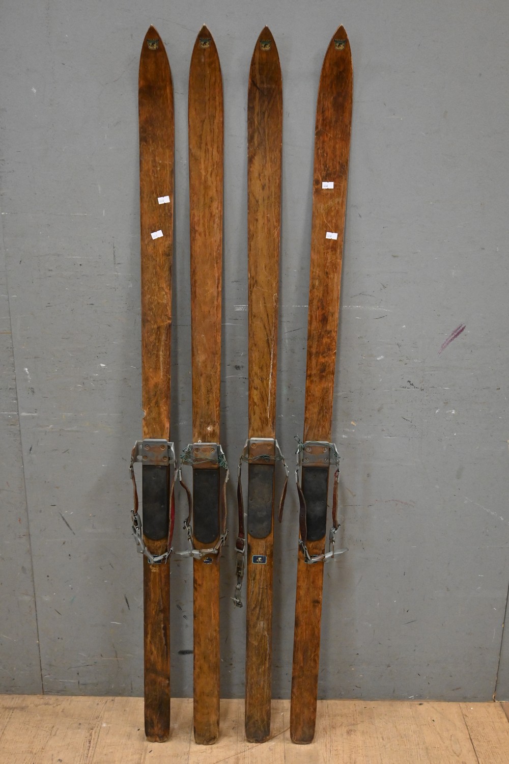 A COLLECTION OF FOUR SCANDINAVIAN VINTAGE TIMBER SKIS BY KARHU (A/F) (151 CM H) (LEONARD JOEL DELIVERY SIZE: MEDIUM)