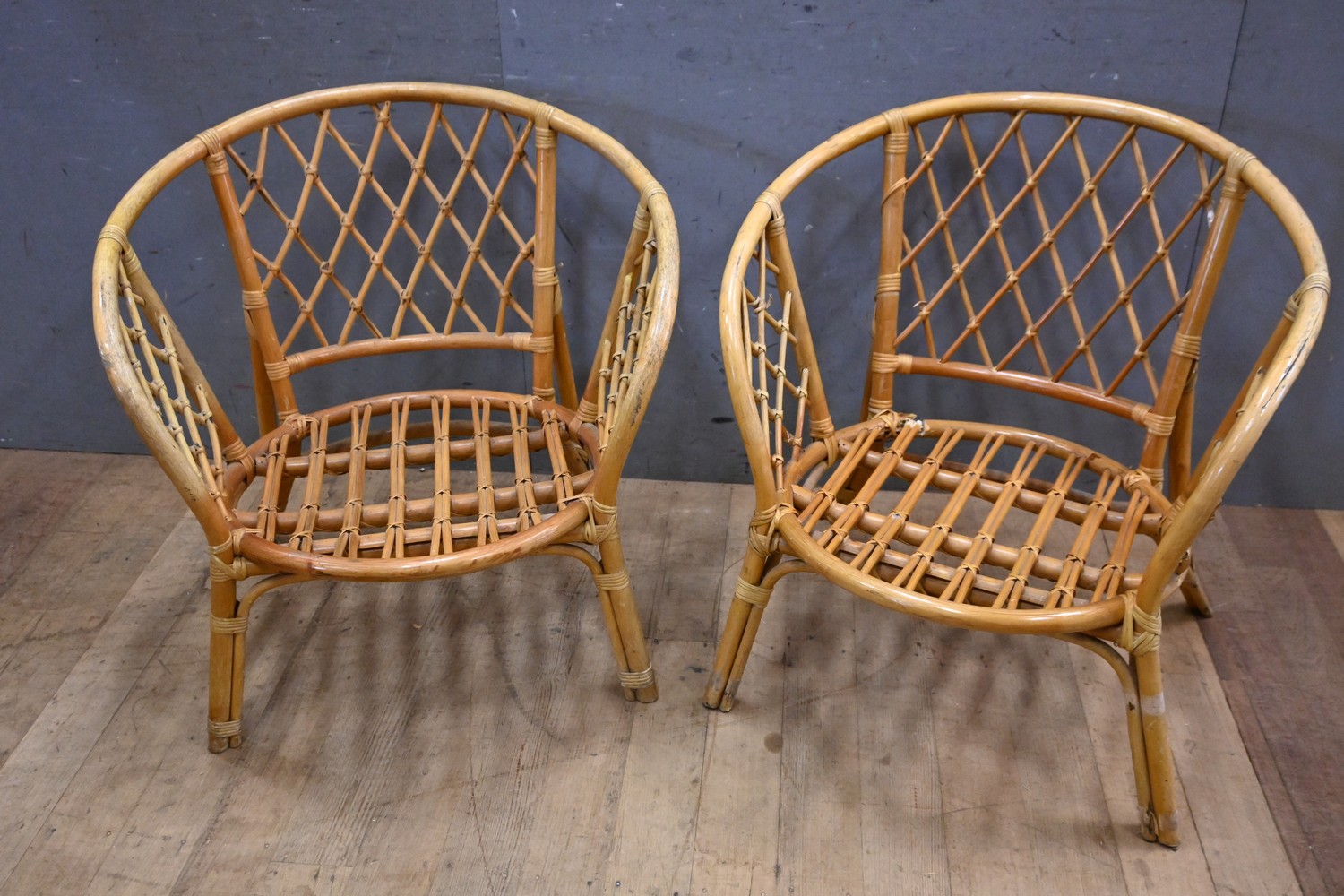 A PAIR OF DANISH CANE LOUNGE CHAIRS (A/F) (78H X 76W X 66D CM) (LEONARD JOEL DELIVERY SIZE: LARGE)