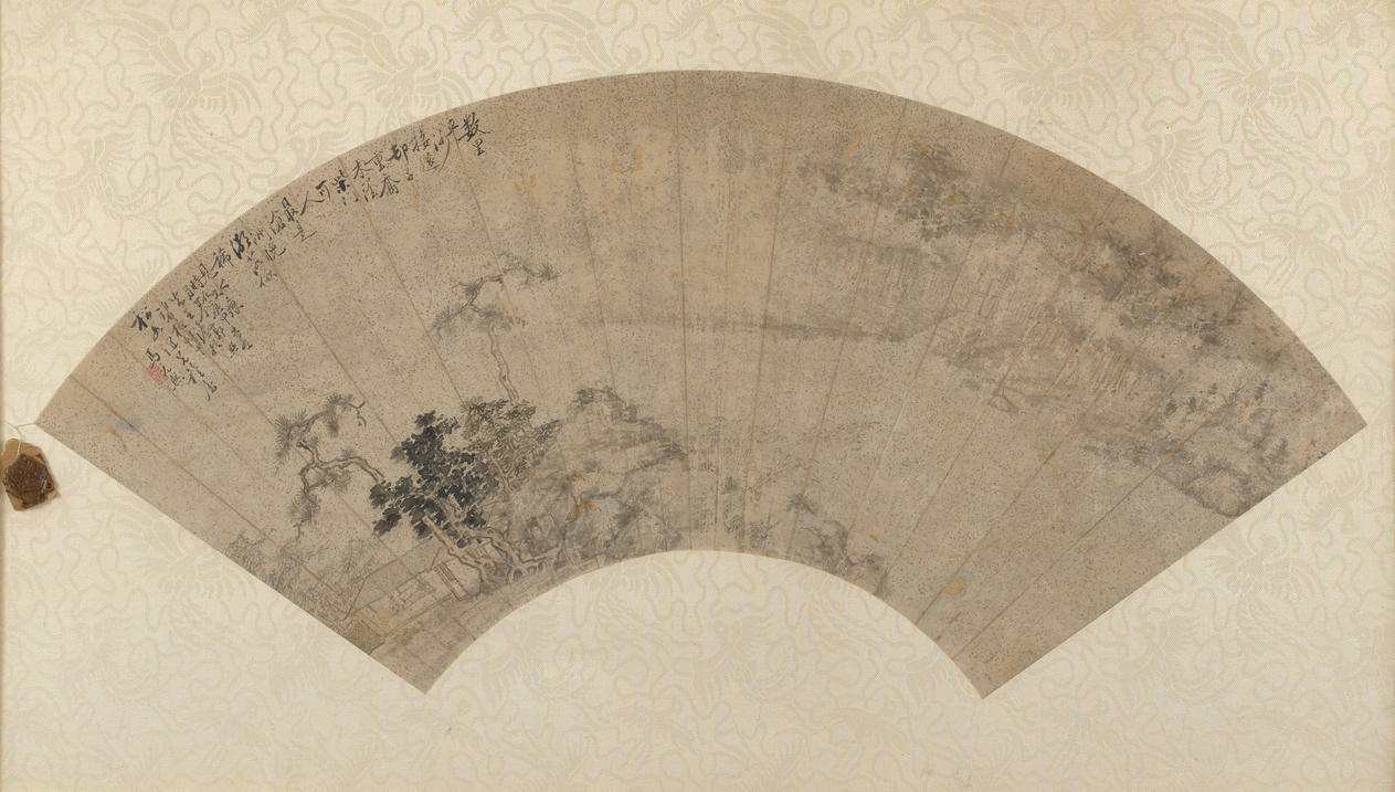 Depicting a classical Chinese landscape on gold-flecked paper, inscribed with calligraphy to the upper-left corner, mounted on silk brocade, framed.